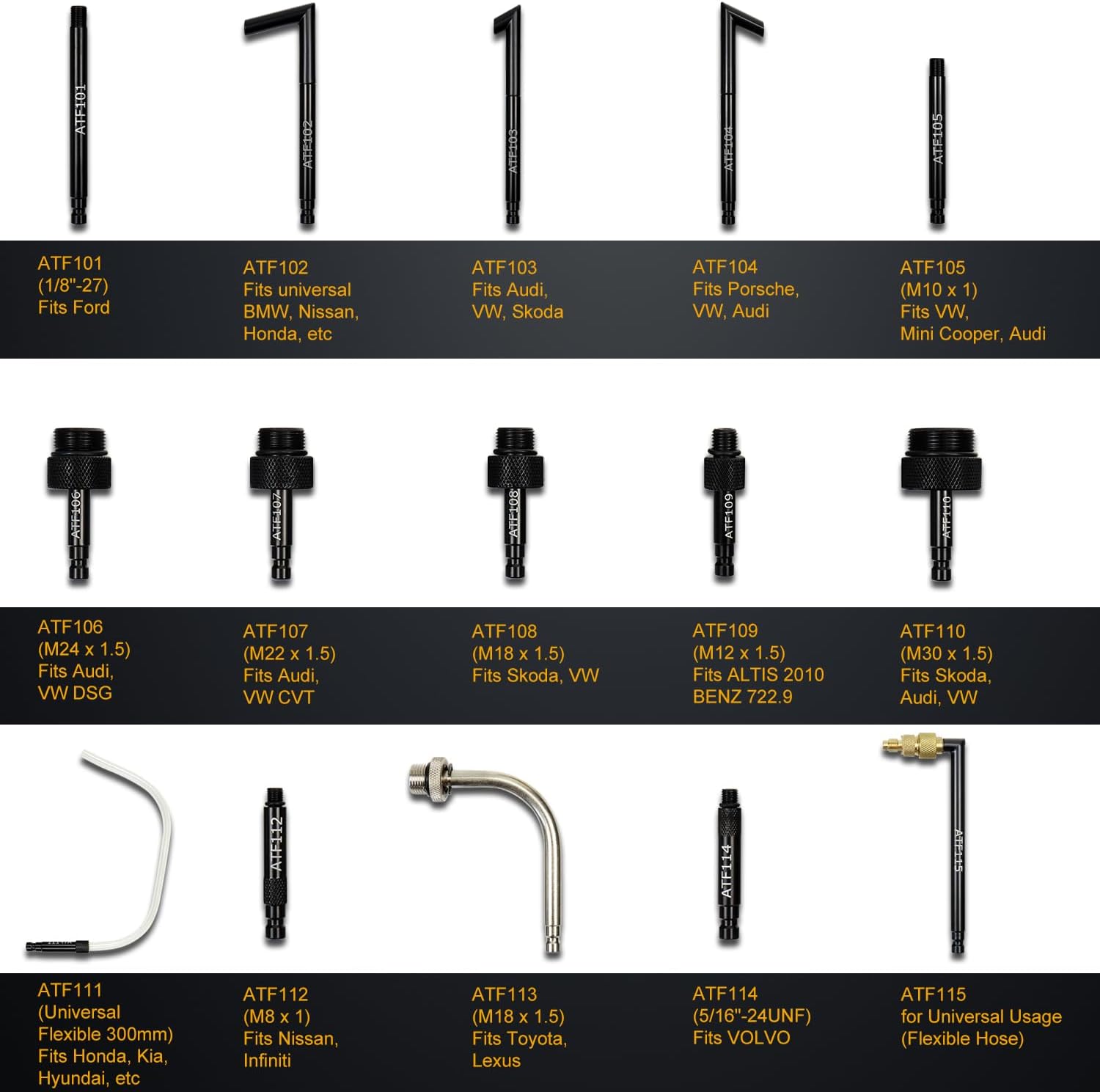 - ATF Adapters: ATF extractor and dispenser tool includes 15 PCS ATF adapters, which are well kept in a blow-molded case. These adapters compatible with Ford, BMW, Nissan, Honda, Audi, Volkswagen DSG, Volkswagen CVT, Skoda, Porsche, Mercedes, Mini Cooper, Kia, Toyota, Hyundai, Infiniti, Volvo and Lexus. Unplug the drain plug at the bottom of the gearbox, drain the used transmission fluid, connect the ATF adapter to the fill or drain port, push the new ATF into the engine by the fluid transfer pump