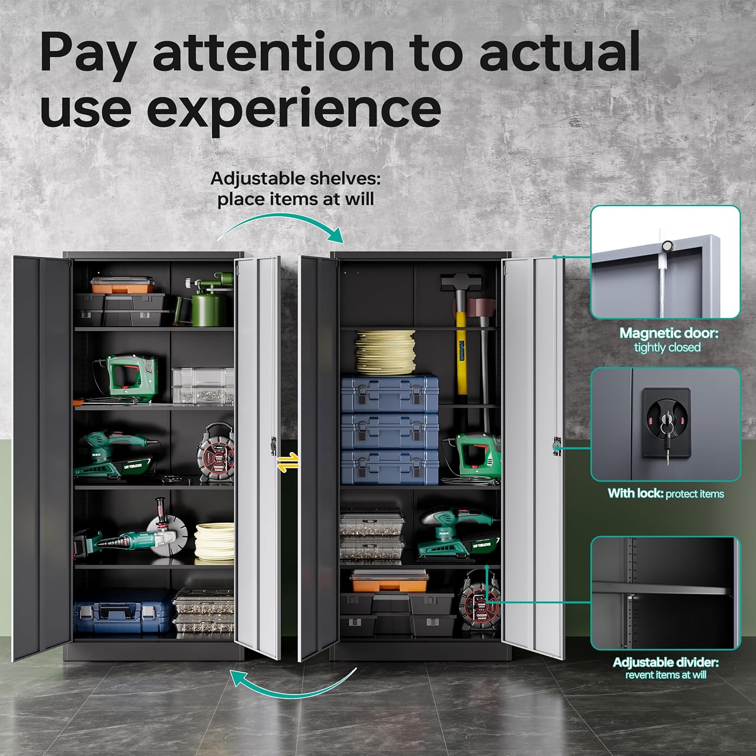 - Multifunctional Cabinet: The storage cabinet with doors and shelves have a lockable door with 2 keys and adopt a 3-point locking system, which allows you to store your valuables safely. This metal storage cabinet with doors and shelves can be used in the home, office, garage, warehouse, workshop, school, or anywhere you need additional storage.