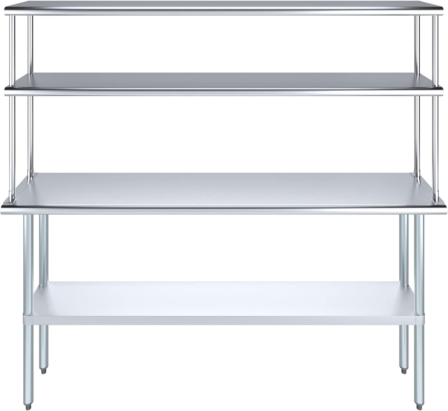 - WORK SAFETY: Work table top and double tier adjustable shelves are constructed from 18-gauge stainless steel, making this restaurant prep and serve table and double tier shelf combo set is durable and long lasting. The table top comes with a galvanized under-shelf for additional storage and adjustable legs for convenience. This table and shelf set is specifically designed and finished for use in a commercial or industrial setting, but is just as reliable in the home.