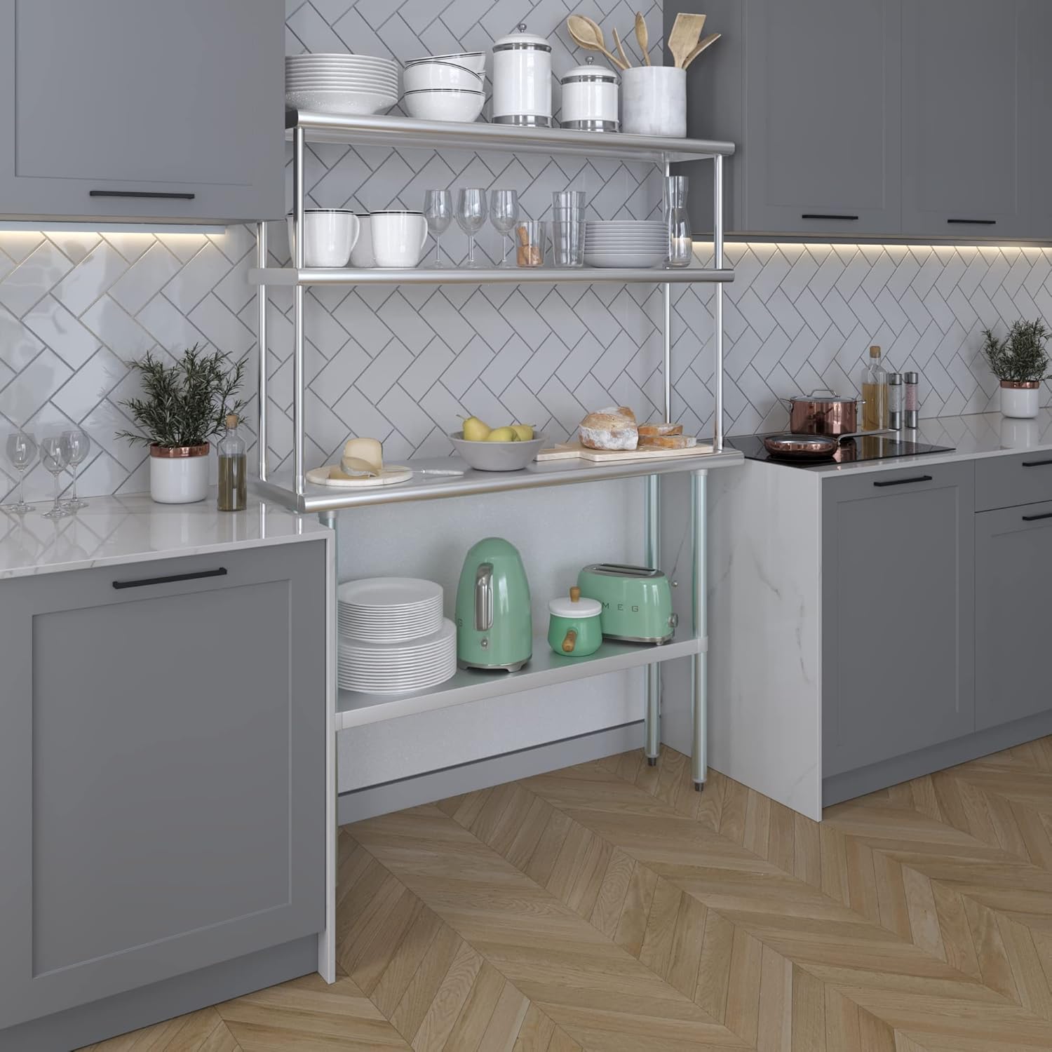 - WORK SAFETY: Work table top and double tier adjustable shelves are constructed from 18-gauge stainless steel, making this restaurant prep and serve table and double tier shelf combo set is durable and long lasting. The table top comes with a galvanized under-shelf for additional storage and adjustable legs for convenience. This table and shelf set is specifically designed and finished for use in a commercial or industrial setting, but is just as reliable in the home.