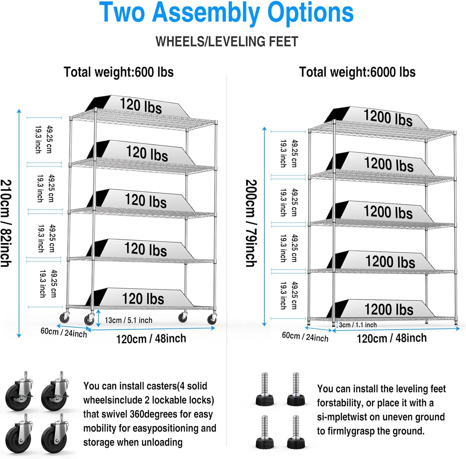 5 Tier NSF Metal Shelf Wire Shelving Unit, 6000lbs Capacity Heavy Duty Adjustable Storage Rack with Wheels & Shelf Liners for Commercial Grade Utility Steel Storage Rack , 82"H x 48"L x 24"D - Chrome