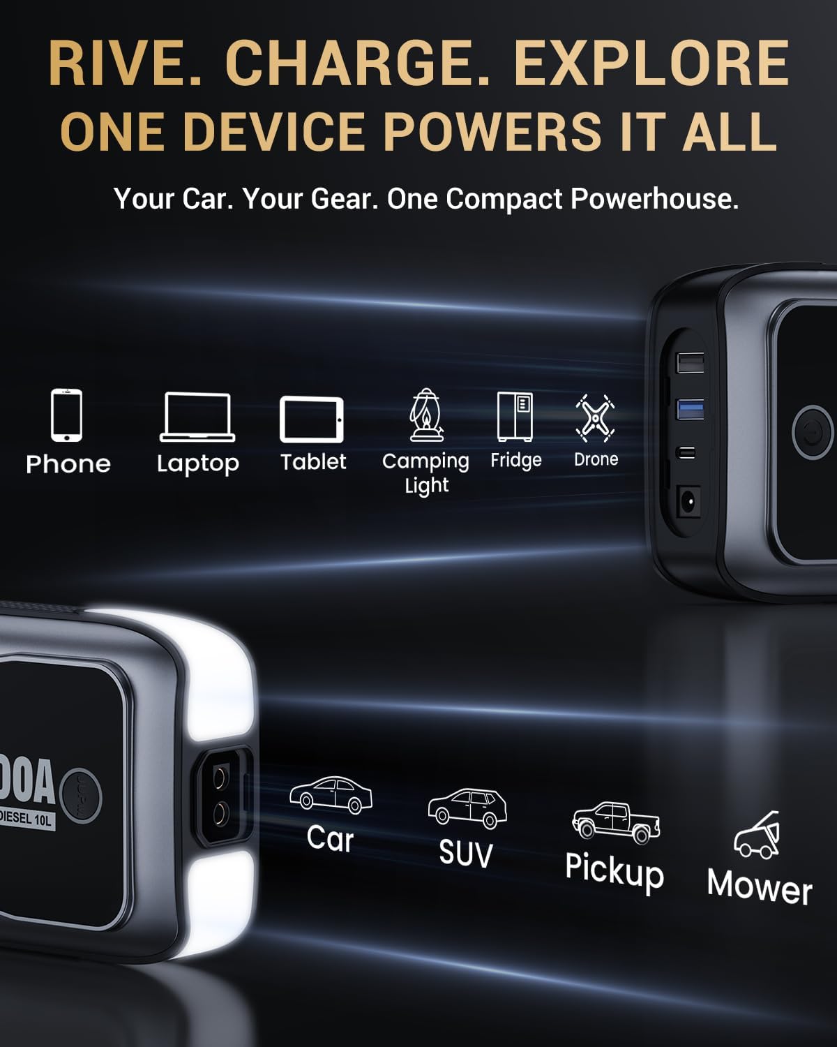- 🚗【 Confident Starts, Every Time 】The MOSTOOL M8 car jump starter delivers a powerful 5000A peak current, built to jump-start all 12V vehicles effortlessly, including sedans, SUVs, pickups, and motorcycles. Designed to start all gasoline engines and up to 10.0L diesel engines, this portable jump starter ensures you’re ready for any journey. Wherever life takes you, the M8 compact jump starter is your trusted power solution