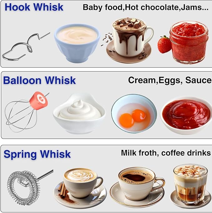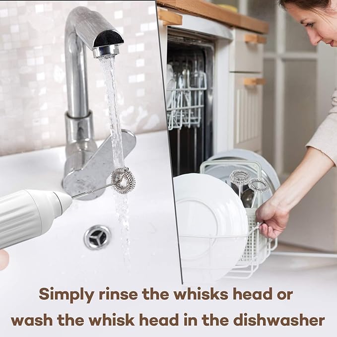 - 【3 stainless steel whisks for various uses】 This foamer comes with 3 detachable whisks made of premium stainless steel, which are durable and easy to clean. You can use the balloon whisk for eggs, the spiral whisk for milk froth and the third whisk for jam supplement. Just rinse them under water after use and store them in the EVA storage bag.