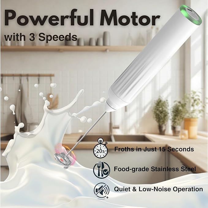 Milk Frother Handheld with 3 Stainless Steel Whisks, Rechargeable Electric Drink Mixer with Stand & Travel Case, Milk Foamer for Coffee, Latte, Cappuccino, Hot Chocolate, Egg,Jam Supplement-White