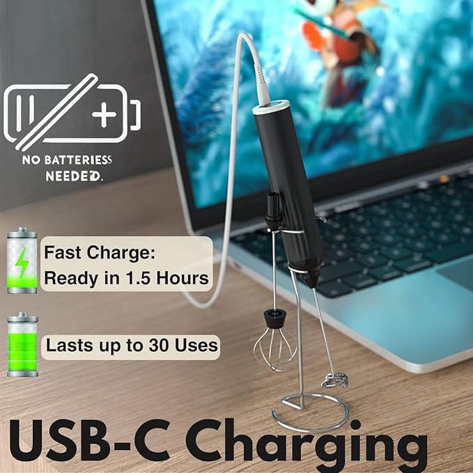 - 【USB C fast charging and long-lasting battery】 This electric milk frother is powered by a built-in 1200mAh lithium battery that can be fully charged in 2 hours via USB C cable. It can work for a long time on a single charge, so you don’t have to worry about running out of power. The battery operated design also makes it convenient to use anywhere without cords.