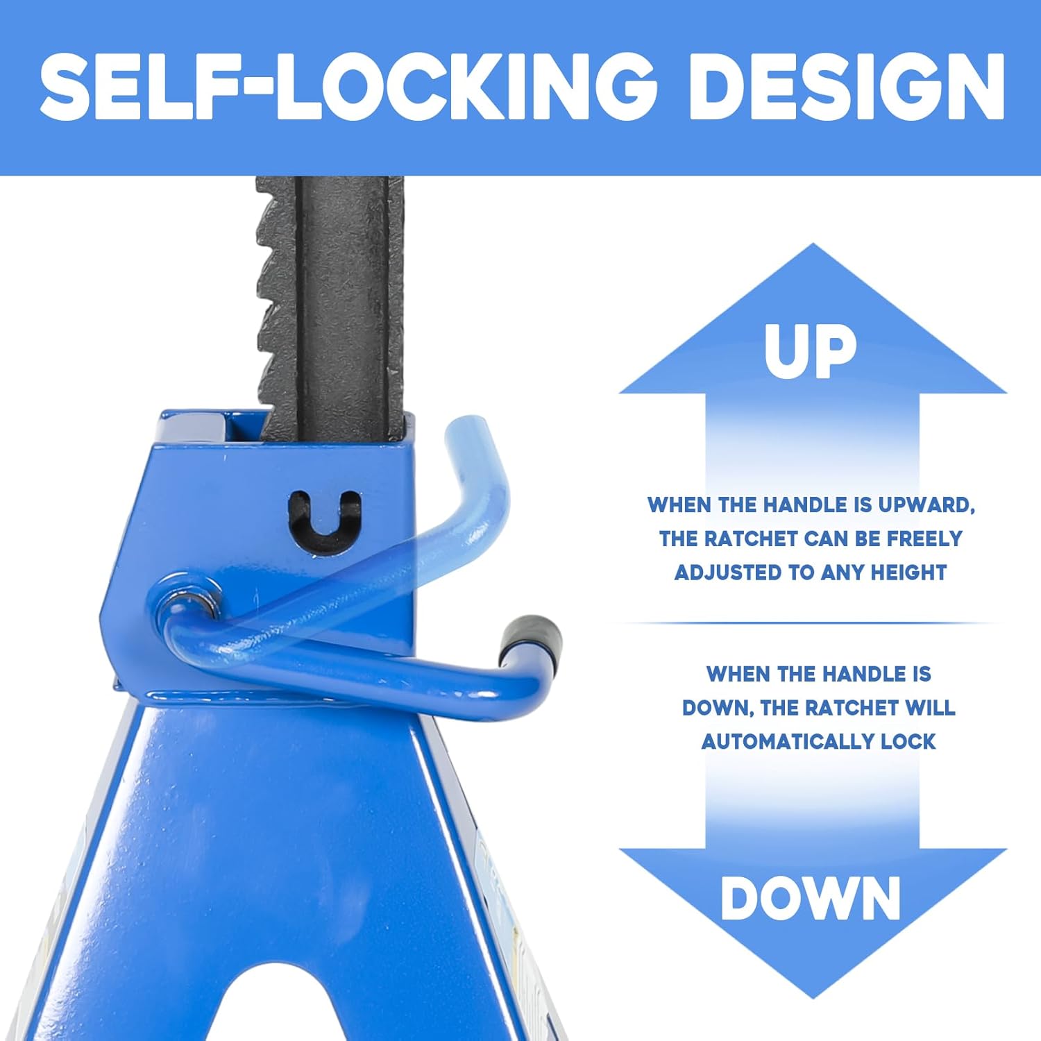 - SELF-LOCKING DESIGN:Our car jack stand is forged iron self-locking ratchet rod, which is easy to use. When the handle is upward, the ratchet can be freely adjusted to any height. When the handle is lowered, the ratchet will automatically lock