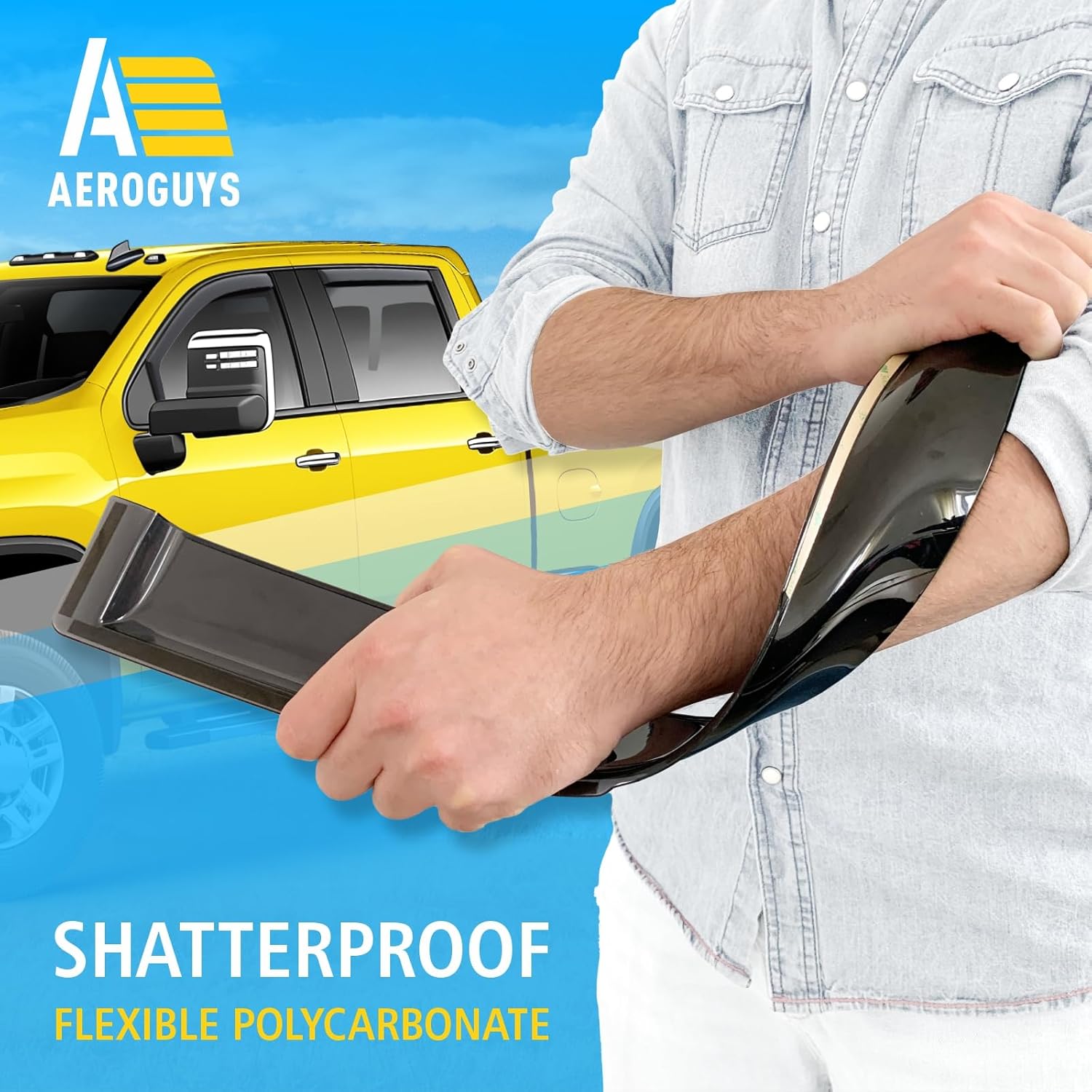 - No Tools Needed, Quick and Easy Assembly β These rain guards are very easy to fit. IN-CHANNEL INSTALLATION provides perfect fit for your truck. Just slip it onto your truckβs window and your job is done within minutes. There is no drilling or no tools required. Be sure that AEROGUYS window deflectors are water resistant, sun protective and will not bend, break or crack regardless of the weather conditions.