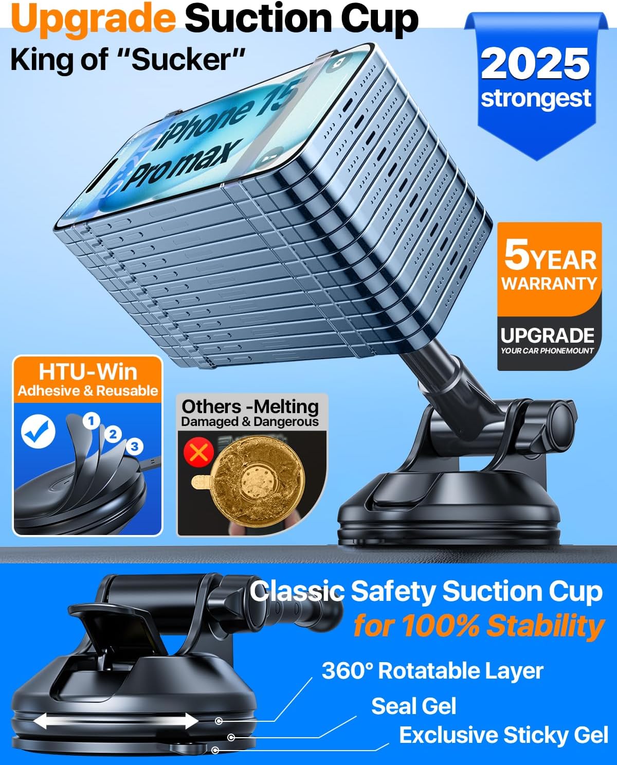 - [2025 Original Design, Magnetic Holder Expert Compatible for Magsafe] Optimizing 17 models and testing 156 kinds of material. HTU R&D team designs the [Strong Magnet, 360Β° Rotatable & Alloy Suction Cup ] windshield dashboard magnetic car phone mount for MagSafe. Industry-only made of Solid Aluminum Alloy & KING of Plastic is certified by CE, RoHS, CP65