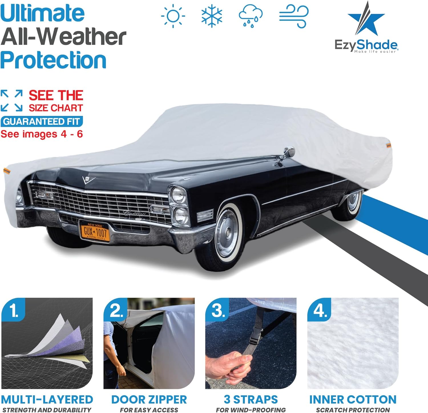 EzyShade 10-Layer Waterproof Sports Car Cover. See Vehicle Size-Chart for Accurate Fit. All Weather Outdoor Covers. Thunderbird Impala Grand Fury Classic Cars. Sun Snow Rain. Size C7 (See SizeChart)