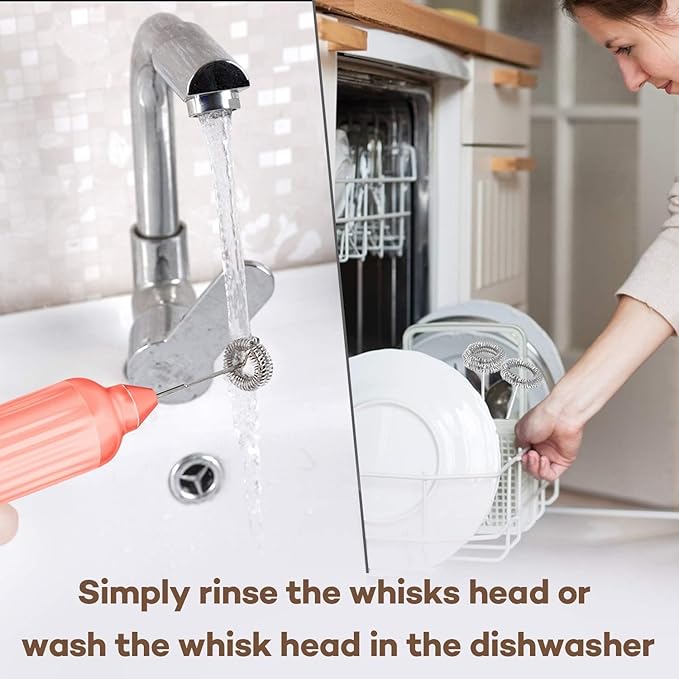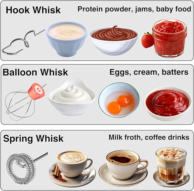 - 【3 stainless steel whisks for various uses】 This foamer comes with 3 detachable whisks made of premium stainless steel, which are durable and easy to clean. You can use the balloon whisk for eggs, the spiral whisk for milk froth and the third whisk for jam supplement. Just rinse them under water after use and store them in the EVA storage bag.