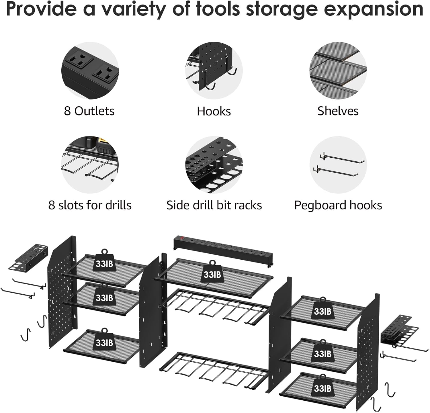 - Black wall mount power tools organizer with power strip, pegboard design, 8 slots, 4 hooks, 4 pegboard hooks and 2 side tool organizer, 3 layer structure shelf and one layer adjustable for actual needs, can keep rechargeable tools organized in the work area and save your bench space.