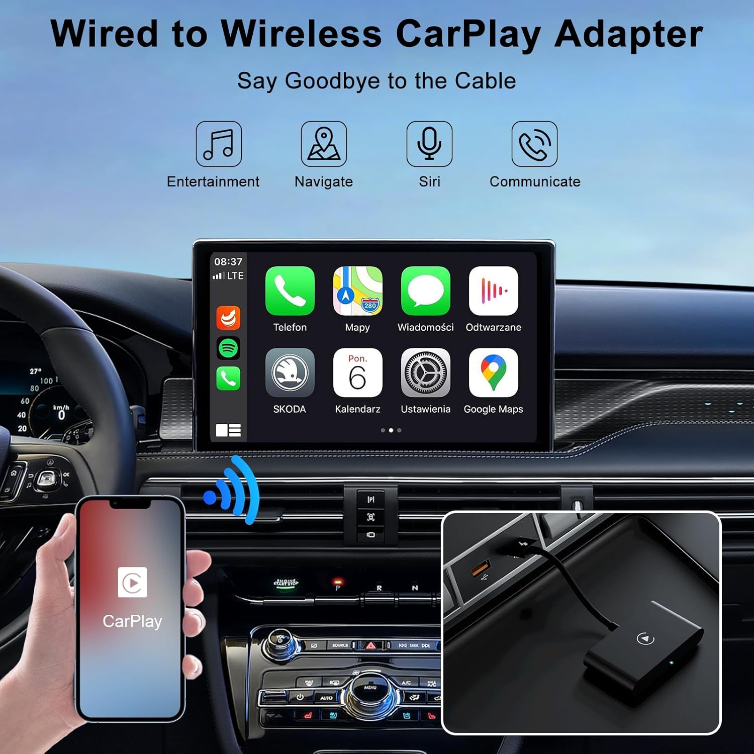 - 【Enjoy Wireless CarPlay】Enjoy wireless CarPlay without a wired connection. Supports the car's original control methods, including touch screen control, OEM knob control, and steering wheel control. You can continue to use full Apple CarPlay functionality, such as navigation, music playback, Siri assistant, phone, etc.