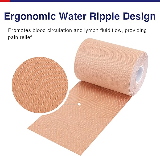 - 【Latex-Free & Breathable】Crafted from 96% latex-free cotton and 4% spandex yarn, this waterproof kinesiology tape 4 inches wide features a water ripple design, ensuring exceptional adhesion and breathability. Exercise and sweat without concern about the tape coming off or causing irritation.