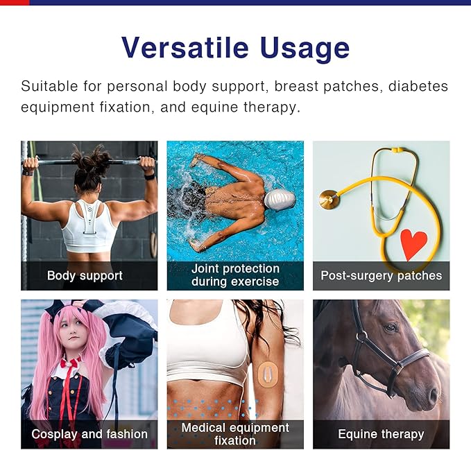 - 【Before Use】Ensure your skin is thoroughly cleaned by removing excess body hair to guarantee a clean and smooth surface. Before your initial use, conduct a patch test by applying a small piece of the extra wide kinesiology tape to your skin to prevent potential discomfort. If any discomfort occurs, discontinue use immediately.