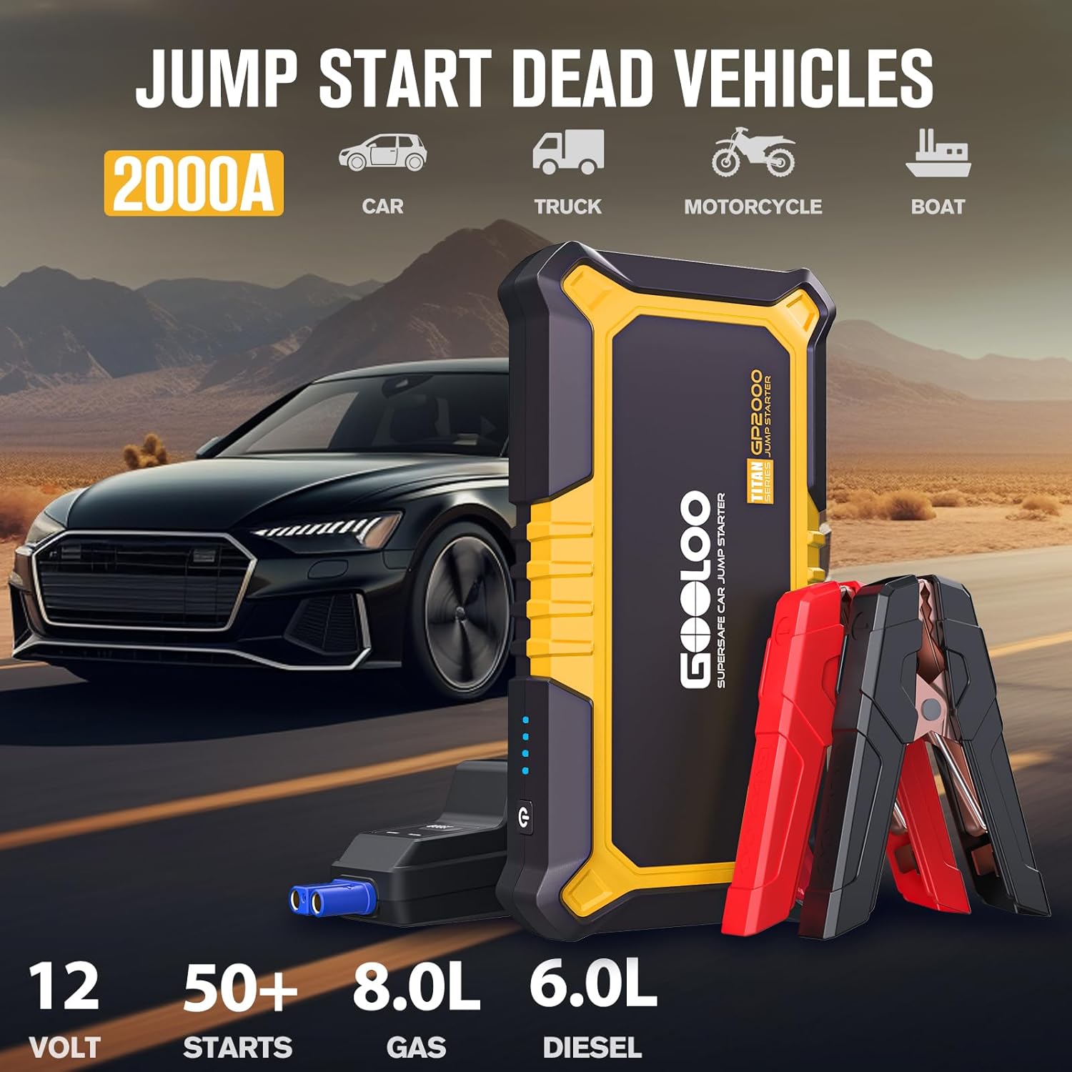- Emergency Life Saver:The GOOLOO car battery charger jump starters with 2000A peak cranking power will jump start all 12-volt dead vehicles up to 8.0L gas or 6.0L diesel. The GP2000 car jump starter battery pack is suitable for cars, motorcycles, SUVs, trucks cargo vans, ATVs, snowmobiles, yachts, and many more.