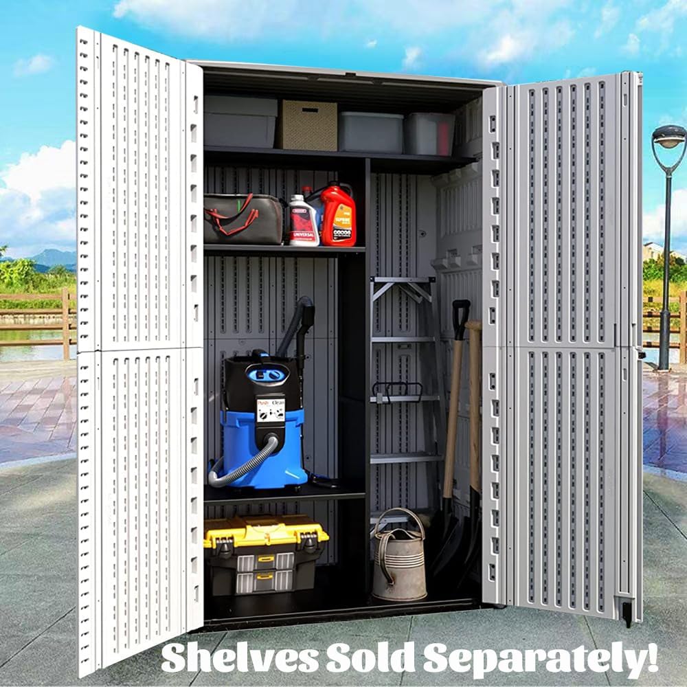 - 【TWIN-WALL PANELS DESIGN】 ADDOK HDPE Resin vertical storage cabinet adopt twin-wall panels design which is blow molded, It’s more study and more durable for storing long/large tools, most large garden accessories.
