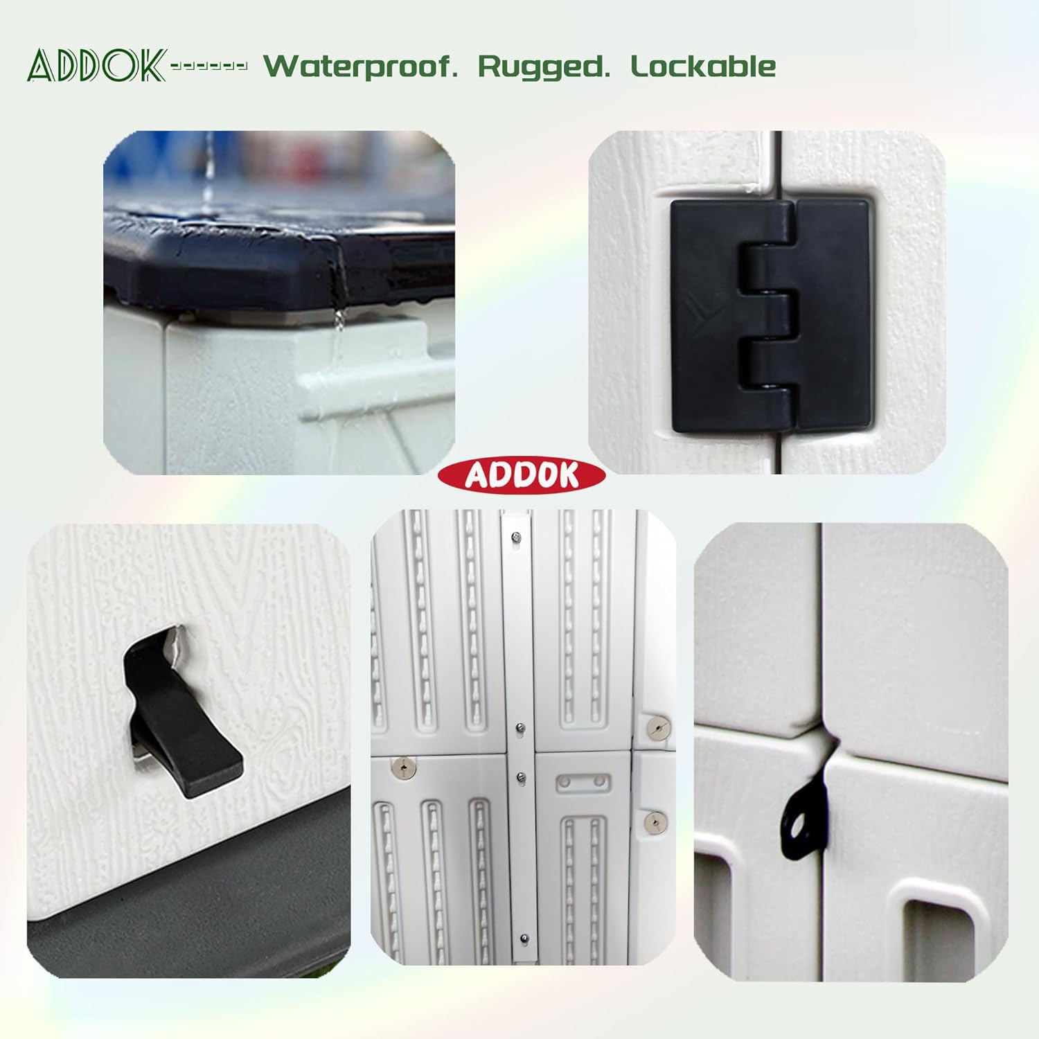- 【PERFECT FOR YOUR NEEDS】 ADDOK Storage Sheds are made of all weather-resistant HDPE resin which is suitable for outdoor use. it can also be locked to keep your tools safe. No matter placed indoor or outdoor, it will be perfect for storing garden tools, BBQ grills, firewood, seat cushions and two - 32Gal trash cans, swimming pool accessories, etc.
