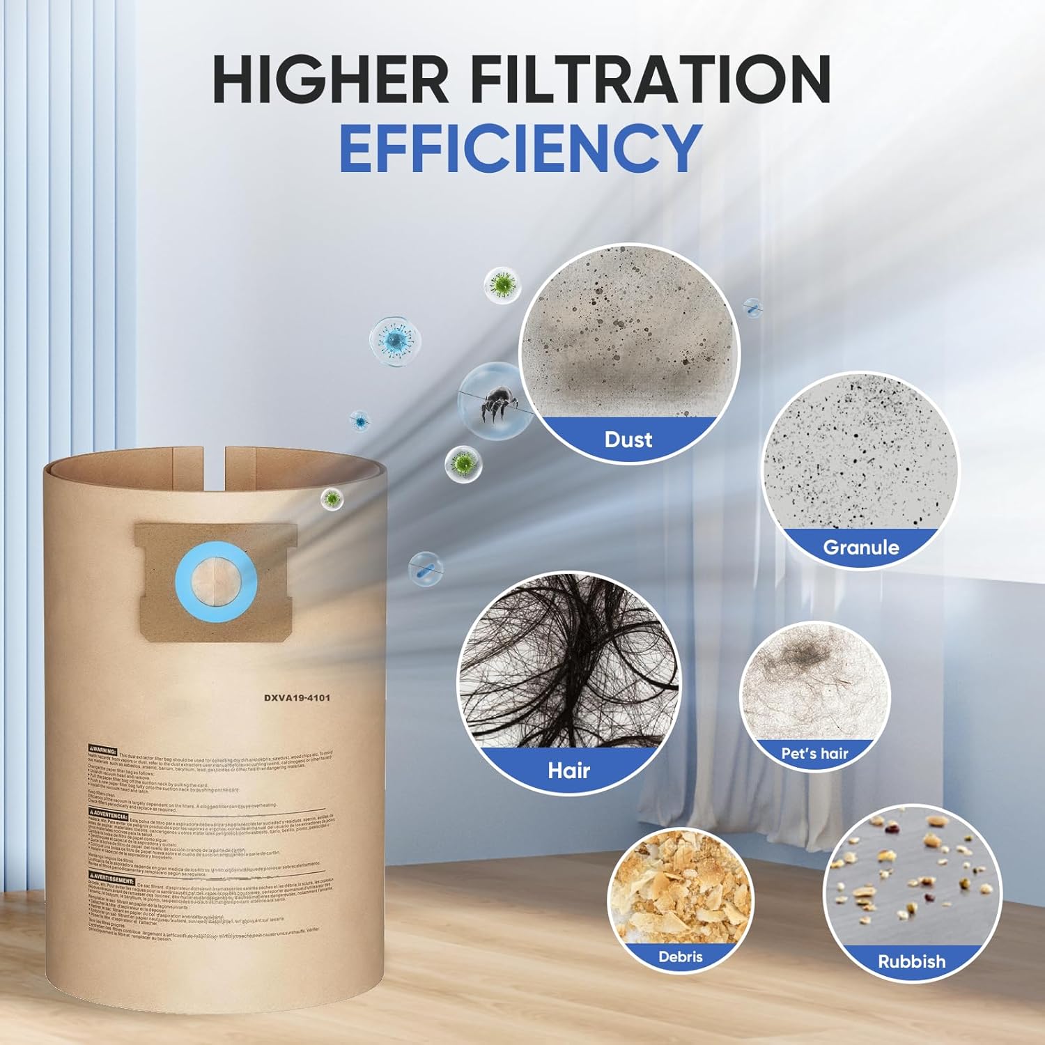 - 【COMPATIBLE MODEL】:DXVA19-4101 6 Gallon Disposable Filter Bag Fit for ①Dewalt 6-10 gallon Wet Dry Shop Vacuum;②Fits Dewalt models: DXV06P, DXV09P, DXV09PA, DXV09PZ, DXV10P, DXV10PL, DXV10S, DXV10SA, DXV10SB, DXV06P-QT, DXV10P-QT, DXV10S-QT, DXV09P-QT, DXV09PQTA;③Compare to Part # DXVA19-4101