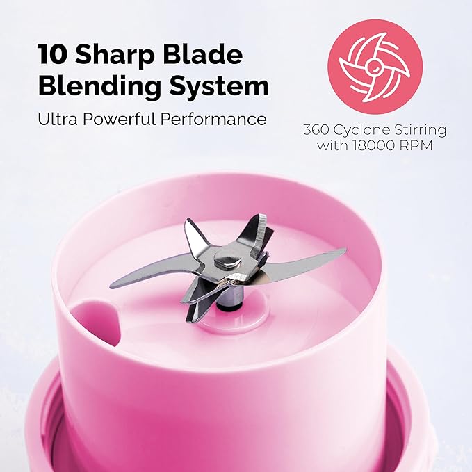 Personal Portable Blender For Shakes & Smoothies, Leakproof & Stylish Portable Mason Jar Shaker, Rechargeable Mini Blender with 10-Blade Blending System 14oz, Pink