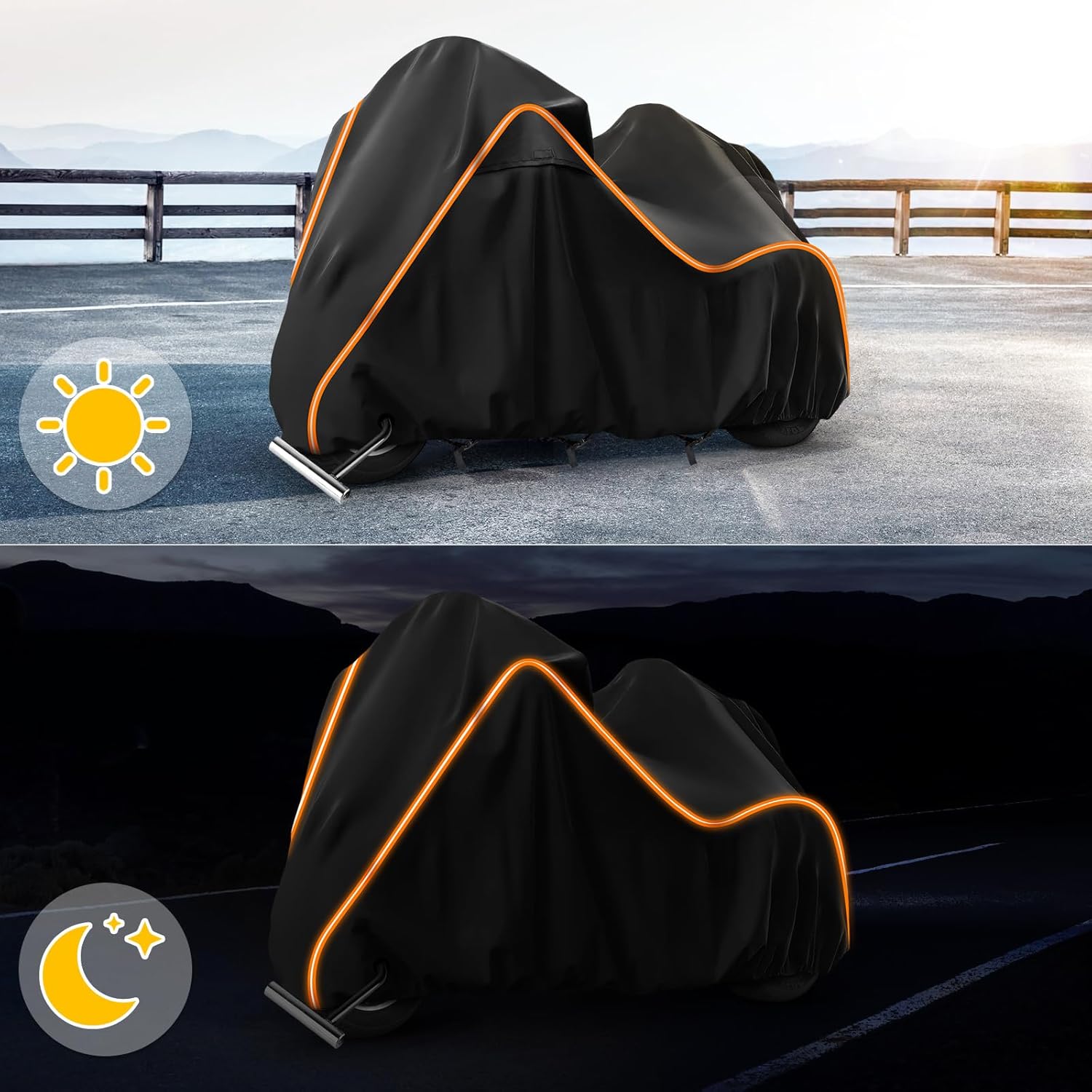 - ăUnique Designsă(1)Two air vents prevent moisture under the cover(2) Waterproof Black PU Coating: UV protection and heat-proof,prevent cracking and aging of inner decoration leather and plastic. (3) Two full Orange Reflective Strips to prevent collisions during the night and depict the body of your motorcycle with a chic look . (4) It comes with a âFRONTâ sign, 2 antenna openings with Velcro, 2 Anti-theft lock holes(No locks) and a storage bag.