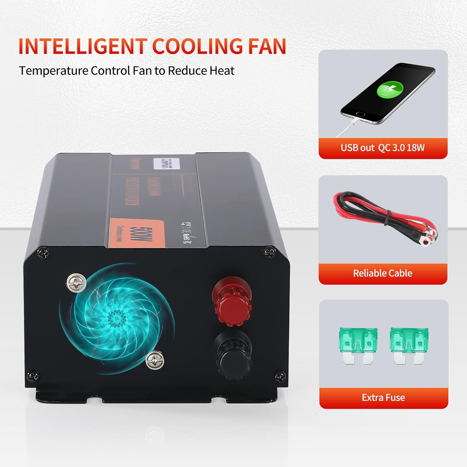 500W Pure Sine Wave Inverter 12V DC to 120V AC Converter for Home, RV, Truck, Off-Grid Solar Power Inverter with Built-in 5V/2.1A USB, Reliable Cable, Remote Controller