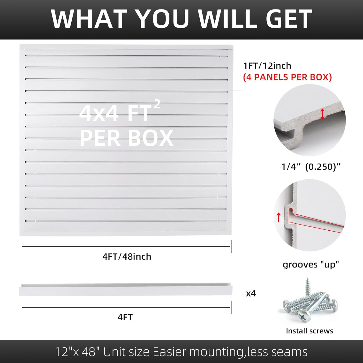Slatwall Panel Garage Organizer Heavy Duty Wall Mounted, PVC Slat Panels Home Storage System, Tool Organization Peg Board 4ft by 4ft (White)