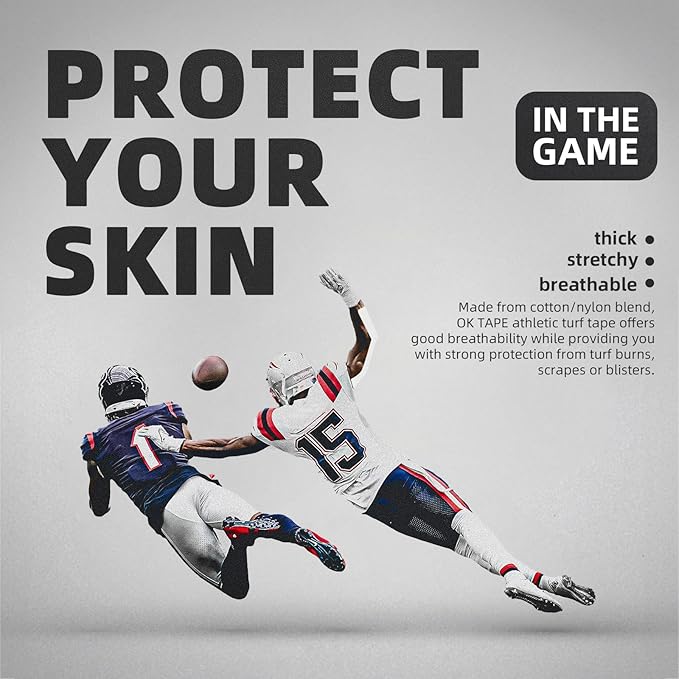 - DURABLE AND WEAR-RESISTANT - OK TAPE turf tape is specifically designed for football sports, using thick, tough and wear-resistant materials, protecting you from turf burns and abrasions during offensive and defensive battles, collisions, and falls.