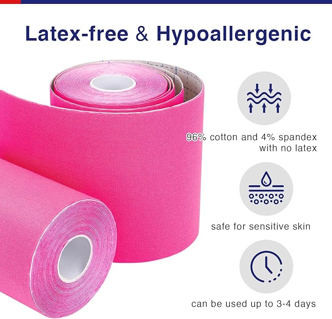 - 【Before Use】Ensure your skin is thoroughly cleaned by removing excess body hair to guarantee a clean and smooth surface. Before your initial use, conduct a patch test by applying a small piece of the extra wide kinesiology tape to your skin to prevent potential discomfort. If any discomfort occurs, discontinue use immediately.