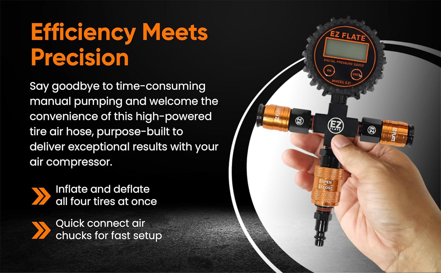 - INCLUDES: 2 EZ FLATE Air Hoses with Rapid Locking Air Chucks, Heavy Duty Carry Bag, Digital 2 way pressure guage, hose straps, EZ FLATE Stickers and Tire Valve Caps