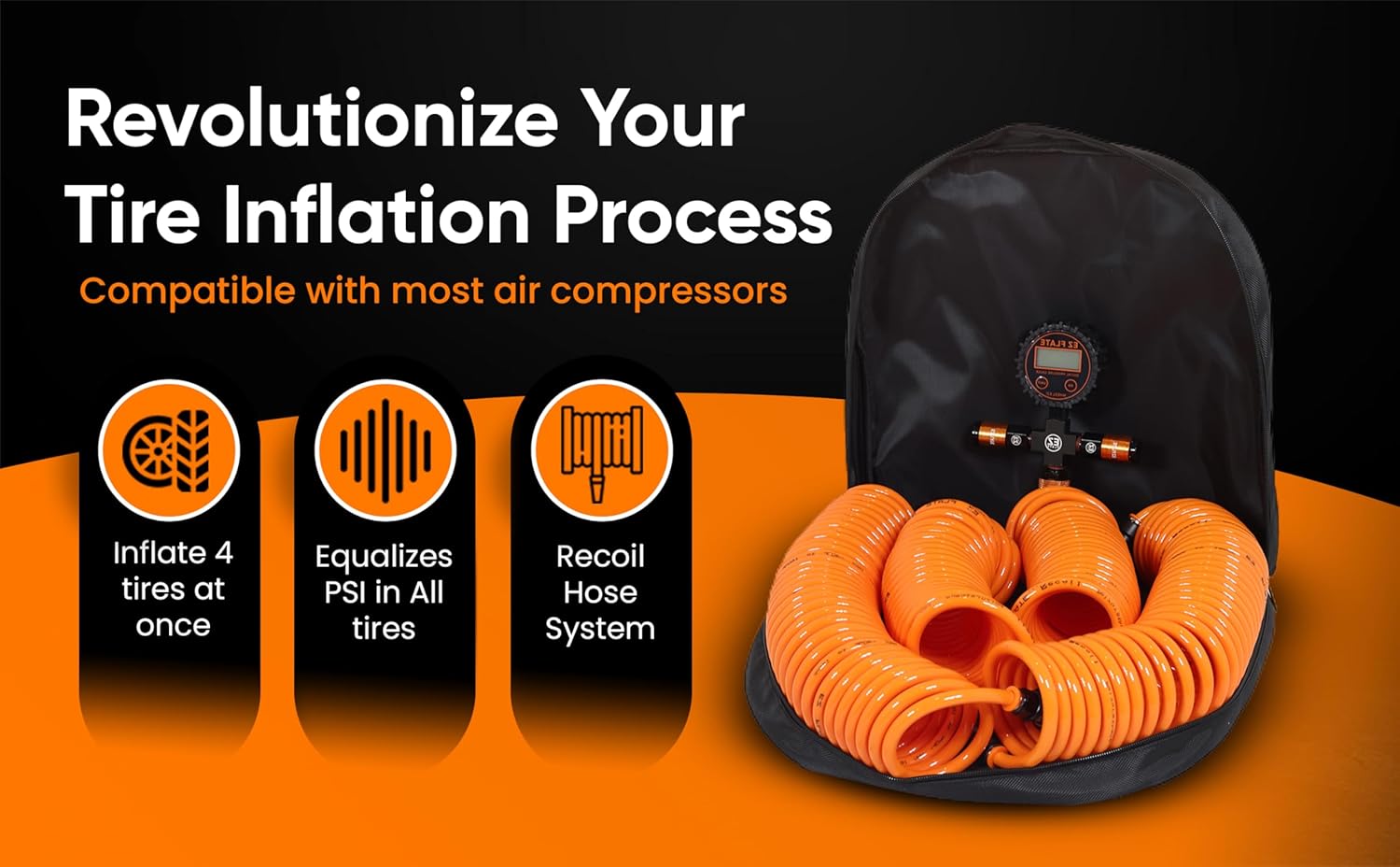 - AUTO EQUALIZE: Our 4 Tire Hose System Automatically Equalizes the PSI in all your tires so you dont have to worry about one tire pumping up more then another!