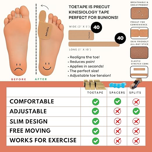 Bunion Corrector & Pain Relief Kinesiology Athletic Tape | For Bunions & Turf Toe | Big Toe Spacer/Separator/Straightener Tape for Men & Women | 80 Precut Kinesiology Tape Pcs | Nude Color