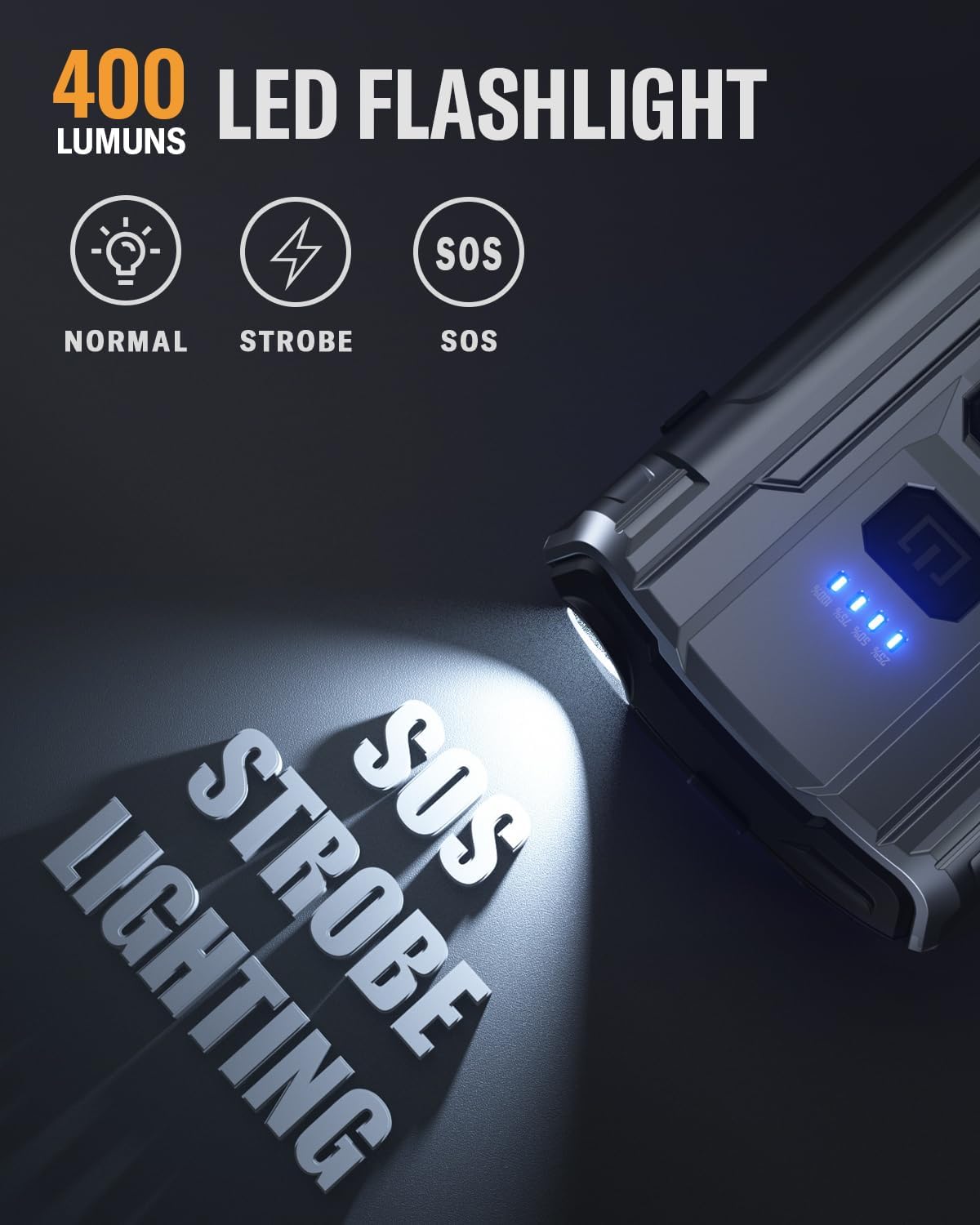 - ă400 LUMENS LED LIGHTăThe jump starter battery pack is equipped with 400 lumens bright LED light that can last up to 48 hours. The luminous area is 2 times larger than other jump starters. 3 modes (flashlight/strobe/SOS) for different emergency situations.