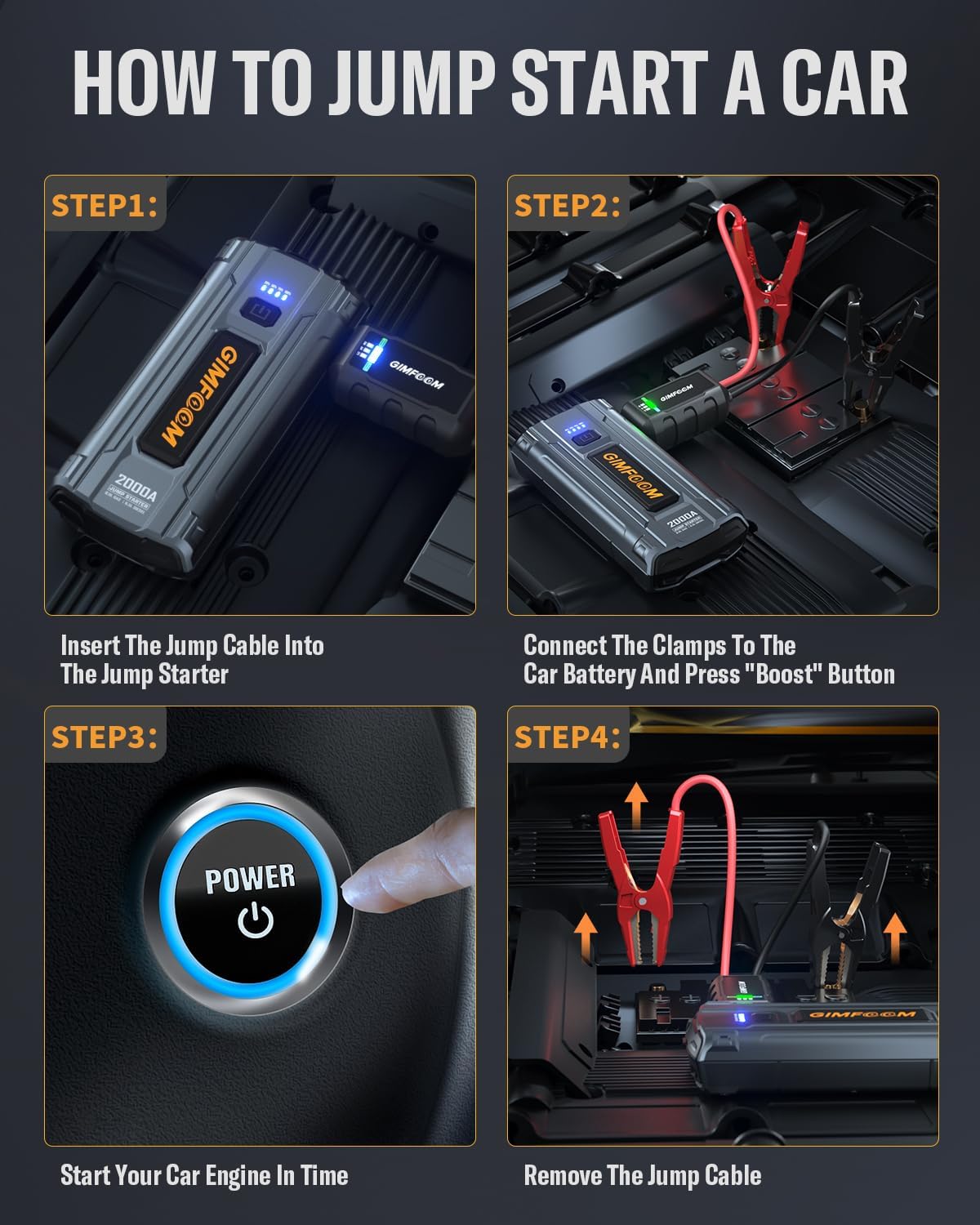 - ăPOWERFUL JUMP STARTERăThe car battery starter is equipped with 2000A peak current to quickly start low voltage and completely drained car batteries. This car battery jump starter with a high-rate lithium battery can start up to 9.0L gas and 7.5L diesel engines. Suitable for 12V cars, trucks, motorcycles, boats, RV's or lawnmowers, etc.