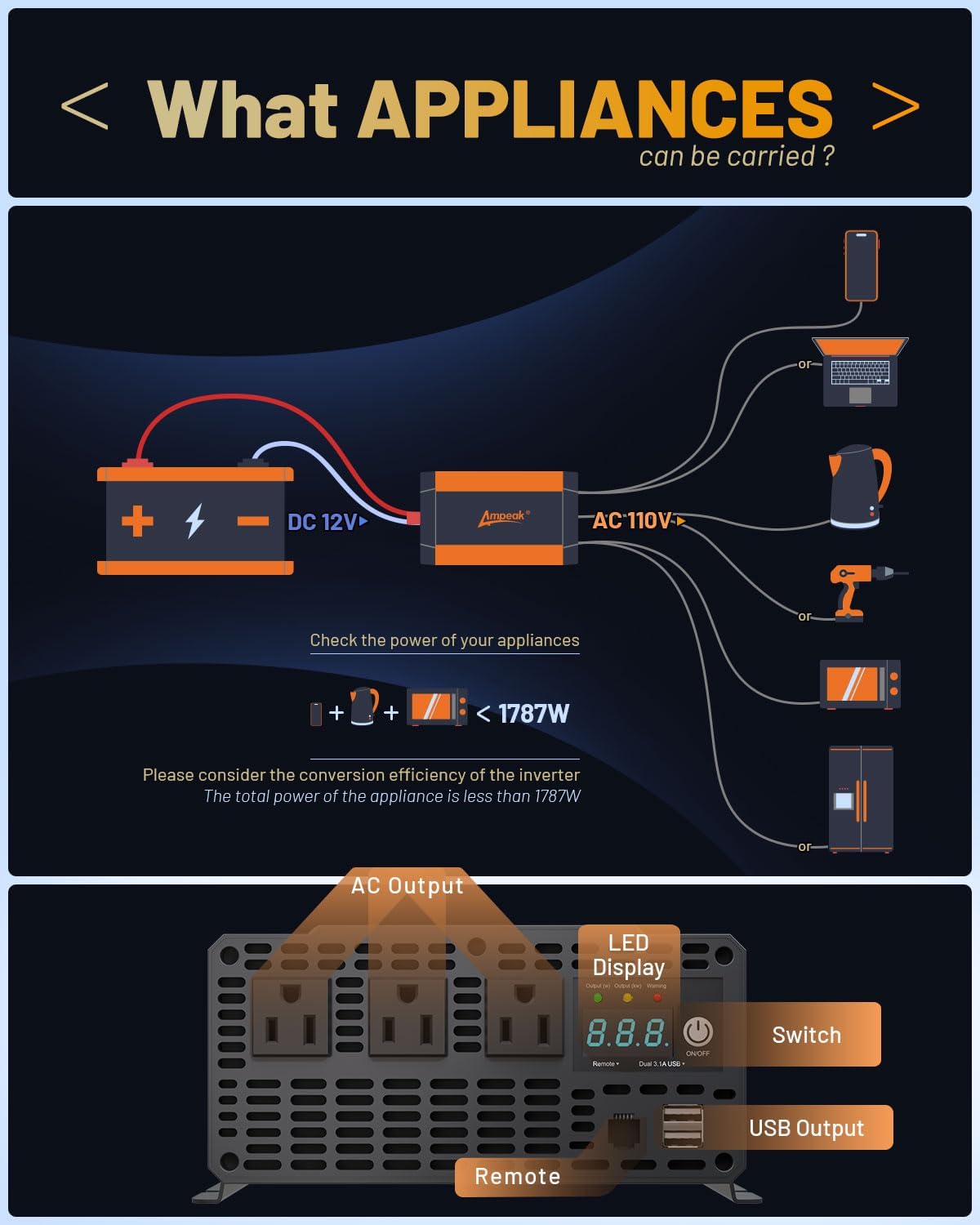 - Ultra-High Conversion Efficiency 12V Inverter: The Ampeak inverter offers an impressive 89.37% conversion efficiency, outperforming competitors at 75-80%. This efficiency saves energy and prolongs the life of your devices.