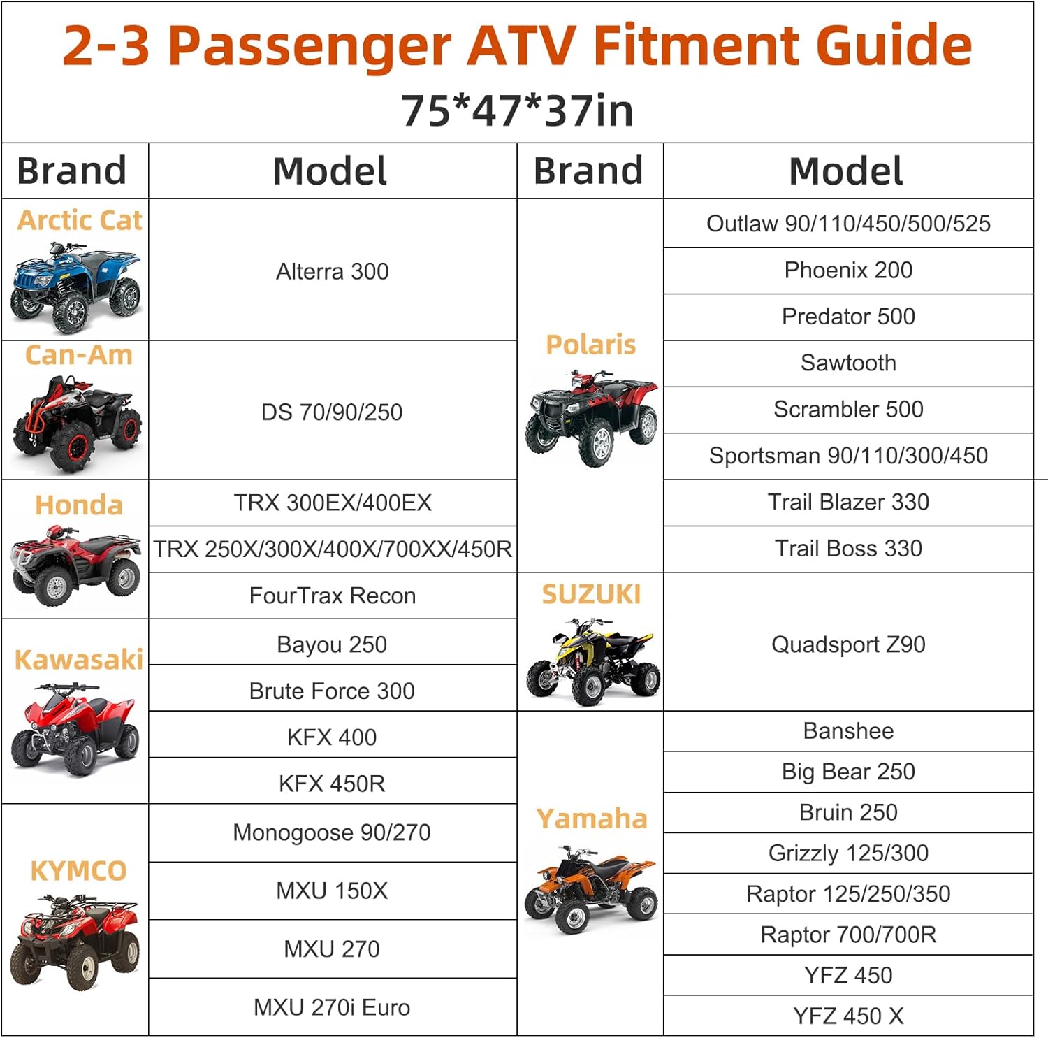 - ăUniversal four wheeler Modelsă:The cover size - 75"L x 47"W x 37"H fit for most ATV, suit for Arctic Cat, Can-am, Honda, Kymco, Polaris, Suzuki, Yamaha ATV and more(To ensure the right size, please measure your ATV before purchasing)