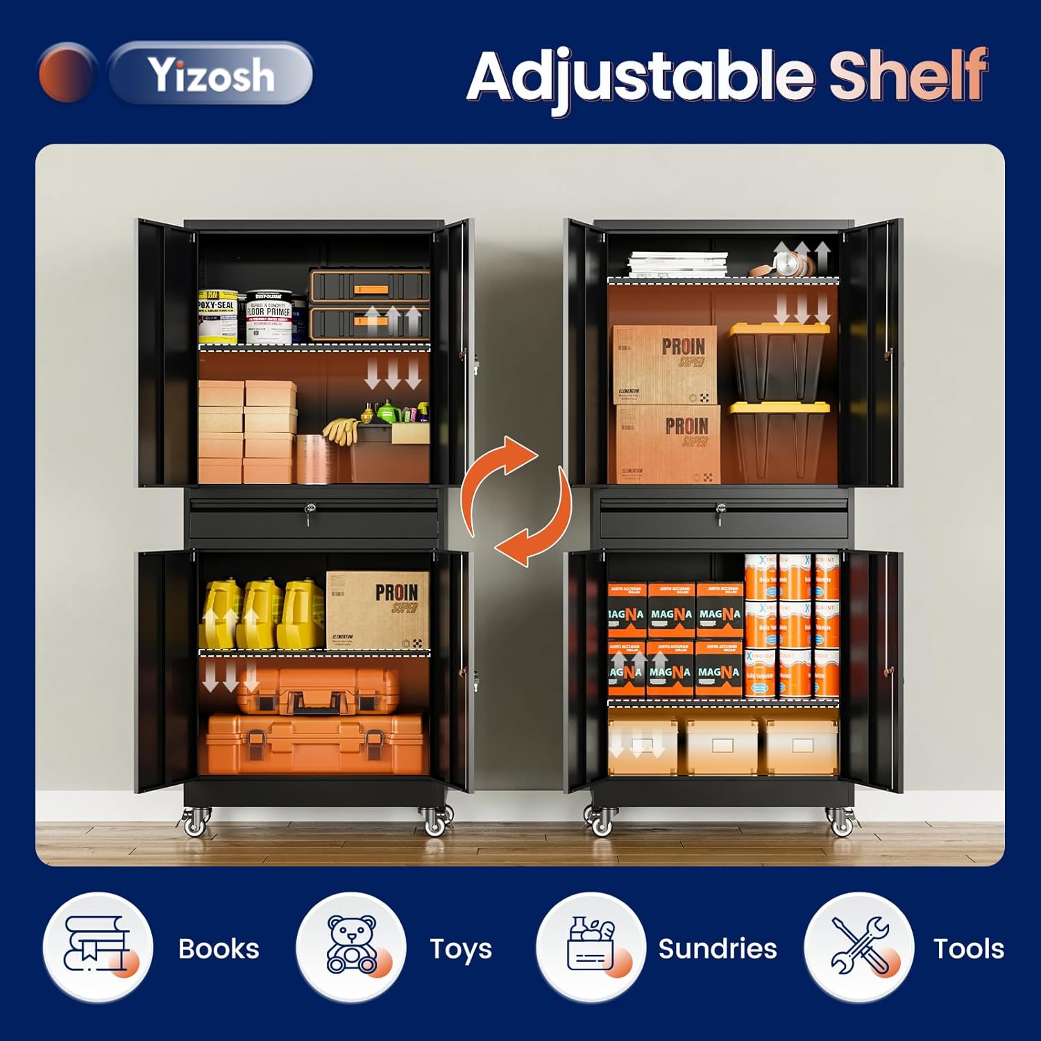 Yizosh Metal Garage Storage Cabinet with Locking Doors and Adjustable Shelves, 73" Rolling Tool Storage Cabinet with 4 Wheels and 1 Drawer for Garage,Warehouse (Black)