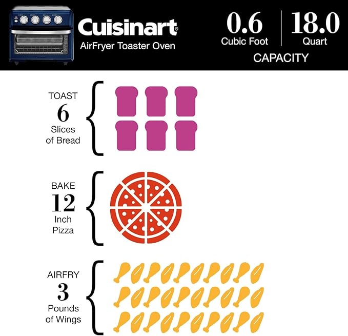 - CAPACITY: Large enough to toast 6-slices of bread, air fry 3-pounds of chicken wings, bake a 12-inch pizza or roast a 4-pound chicken