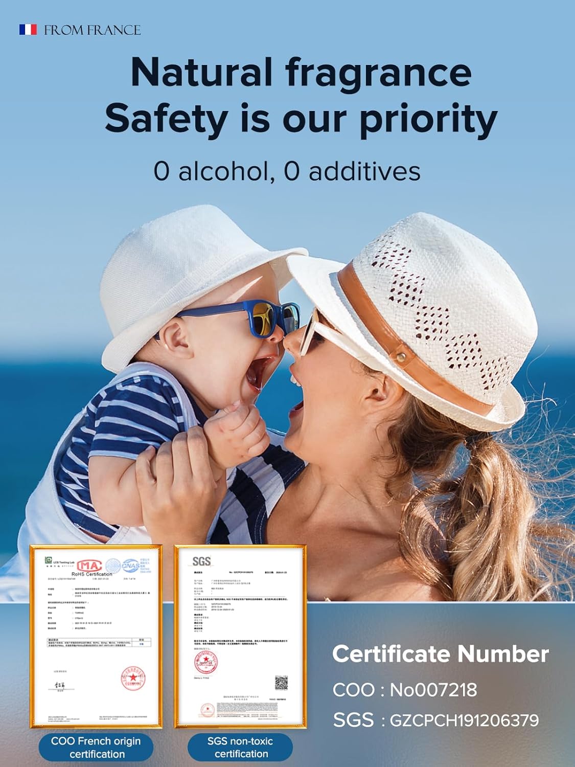 - We never use fragrances that contain alcohol or additives, ensuring that pregnant women, children, and seniors can safely use it.