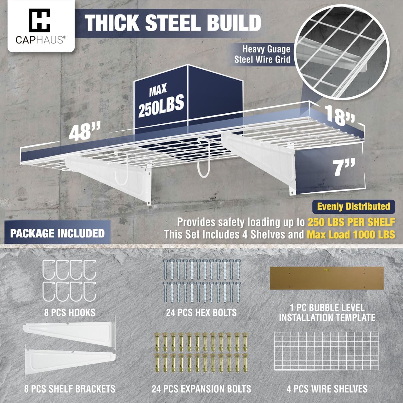 - π¨ Robust Steel Construction - Our garage wall shelving set includes wire shelving and wall brackets with a durable powder-coated finish, marrying a sleek look with sturdiness. The intelligent design of our steel storage rack allows overhead storage and accessory hook usage, maximizing garage space and organization. We provide high-quality screws that have undergone rigorous testing to ensure durability. Each hook included in the package has a weight capacity of 33 lbs.