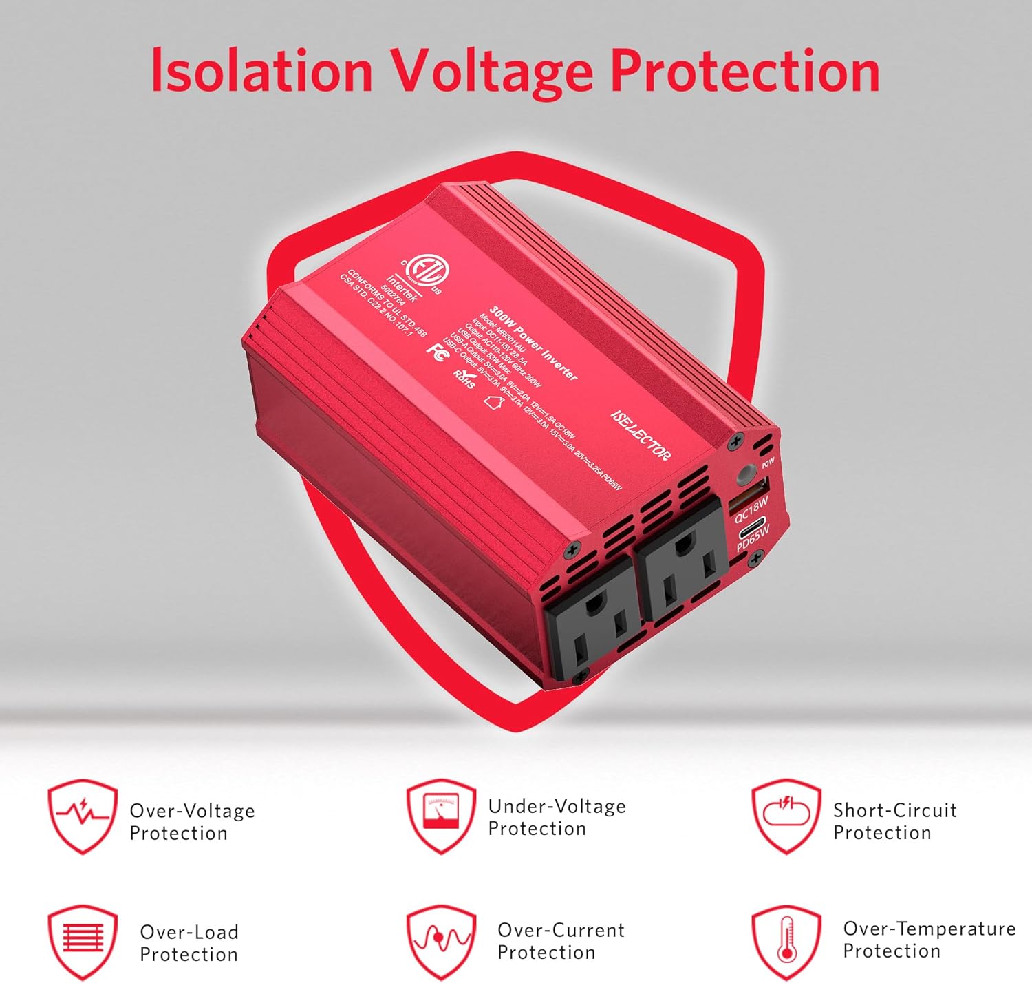 - 300W Power Inverter: Provides 300 Watts continuous DC 12v to AC 110v power inverter featuring 1xPD 65W&1xQC 18W USB ports, 2 AC outlets, and a 23.8-inch cable with cigarette lighter plug, convenient for car accessories charging.