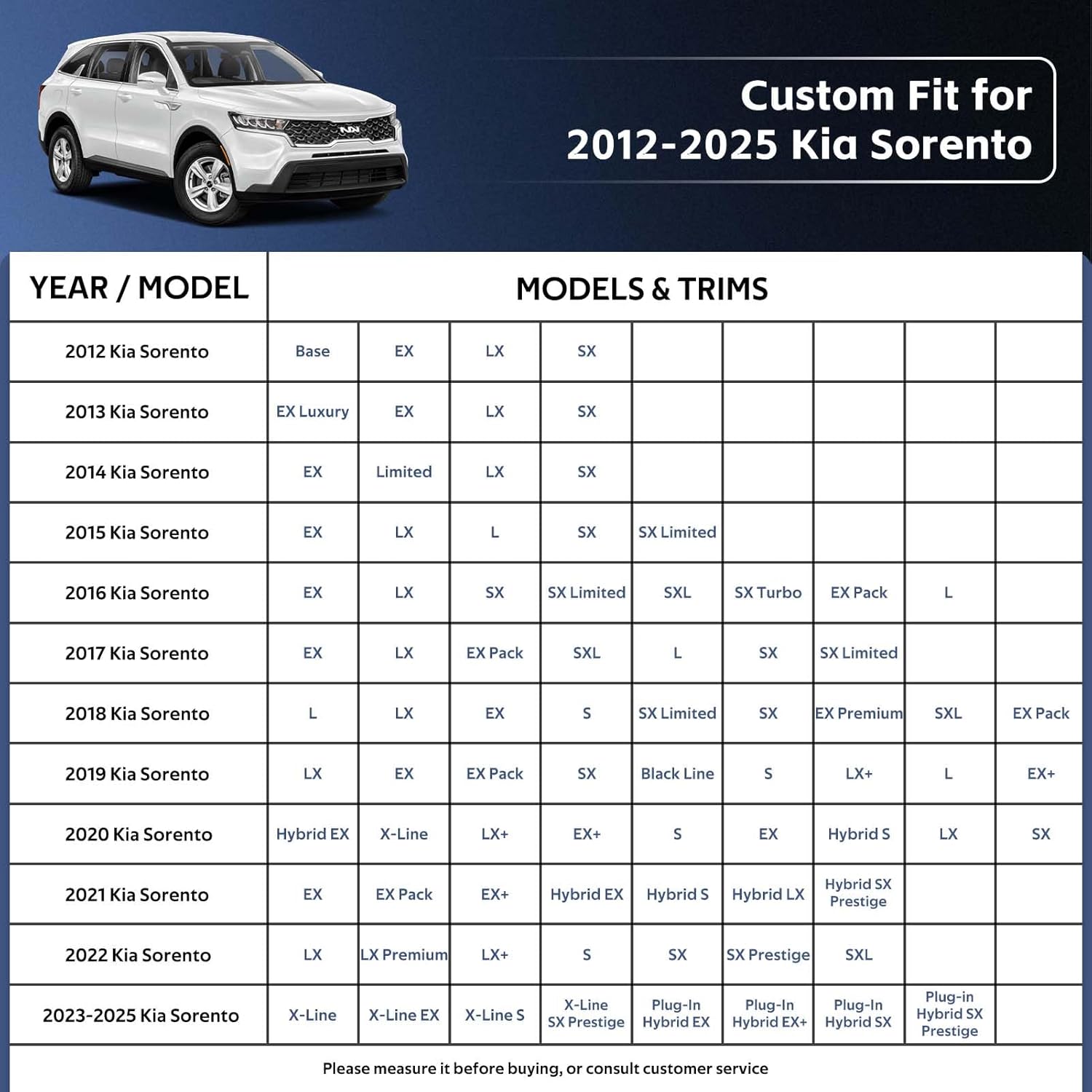- ăPerfect Fităâ Holthly has conducted experiments to obtain a customized car cover specifically designed for Kia Sorento (2012-2024). The custom-like fit of the full cover not only enhances the -aesthetics of your vehicle but also provides superior wind resistance, thereby prolonging the lifespan of the hood. It offers enhanced and long-lasting protection for your car.