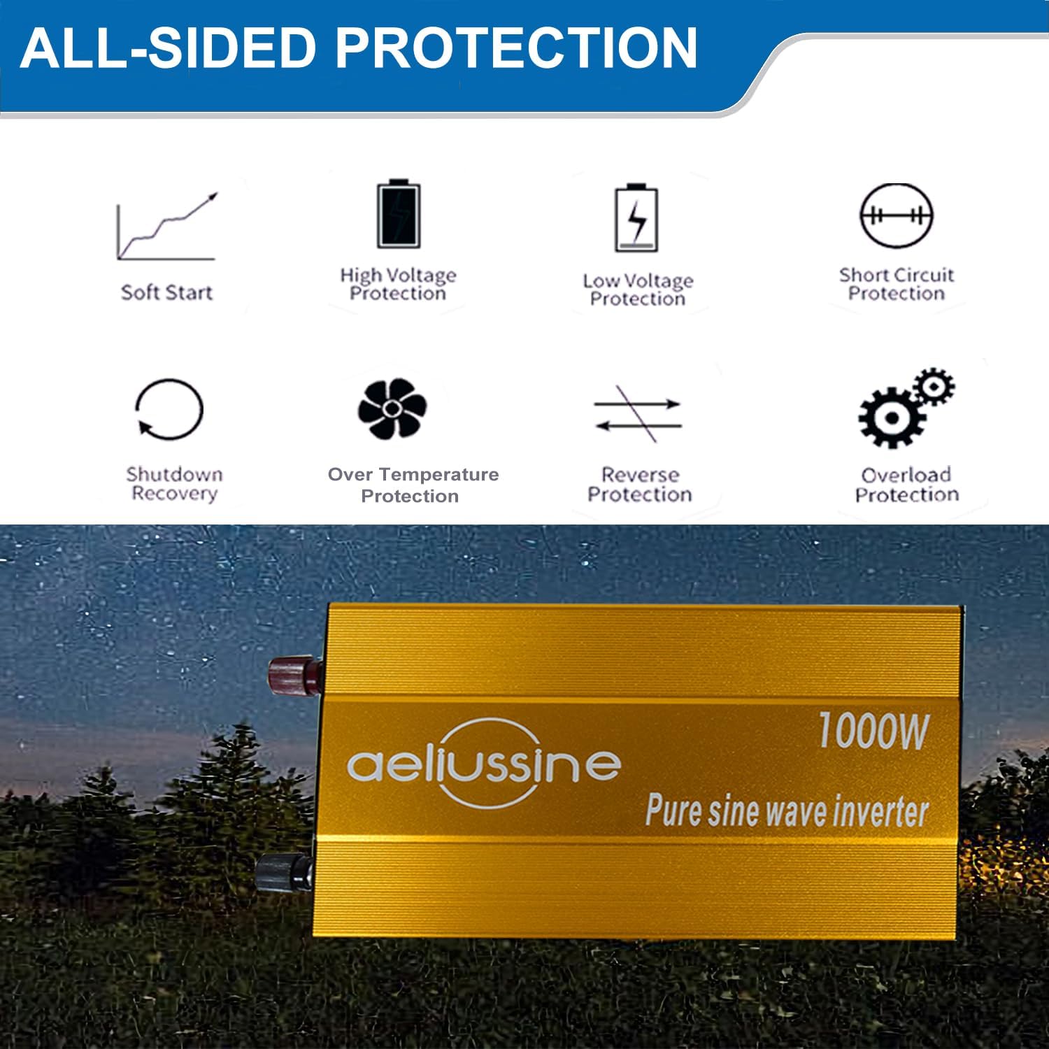 - 【Fully Safety Protections】The pure sine wave inverter has high efficiency and stable performance. It has sound protections including overload protection,over current protection, short circuit protection, battery reverse connection protection, high temperature protection, high or low battery input protection, built-in fuse protection.
