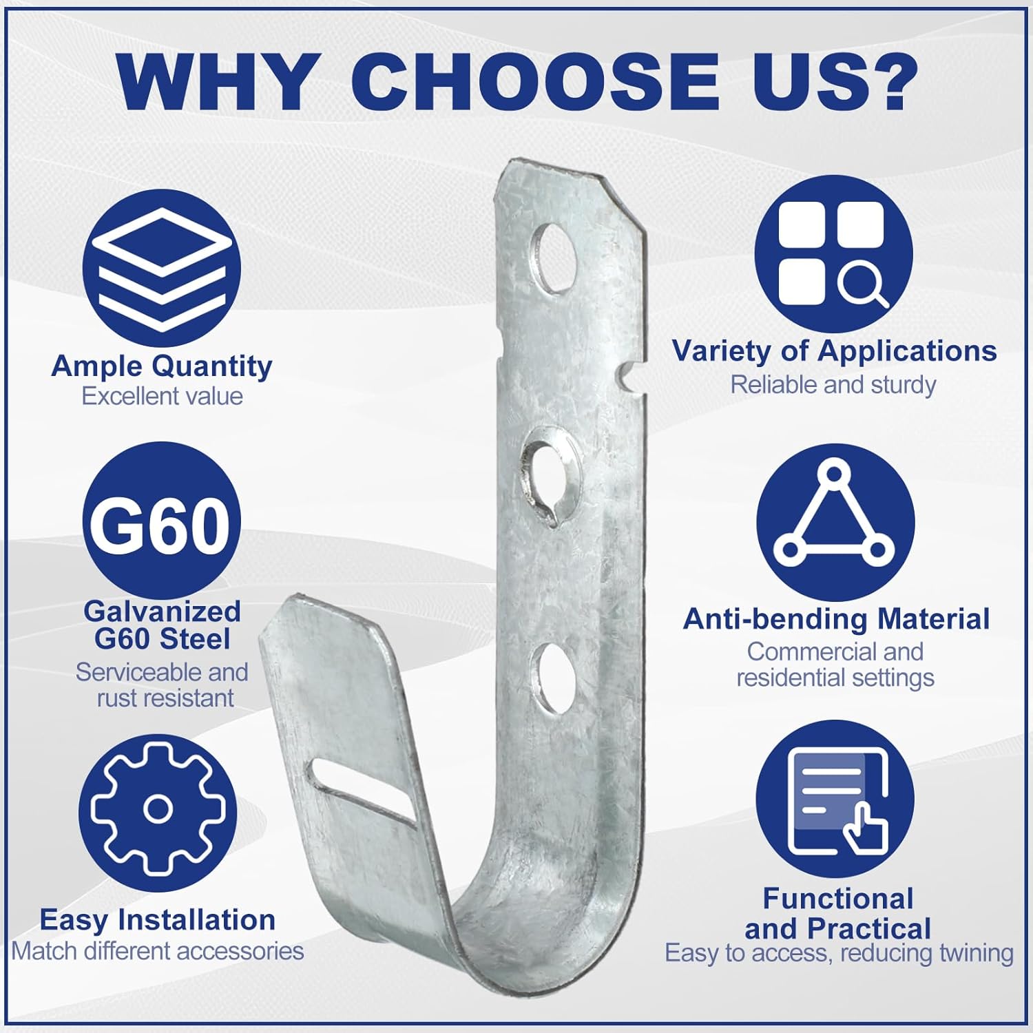 - Robust Material: the j hooks for hanging are constructed from dependable and rust resistant G60 galvanized steel, the heavy duty structure imparts them the ability to withstand regular wear and tear, and these j hooks can hold up to 60 lbs each; The hooks have UL certification, consolidating their reliability and toughness in supporting cables and wires