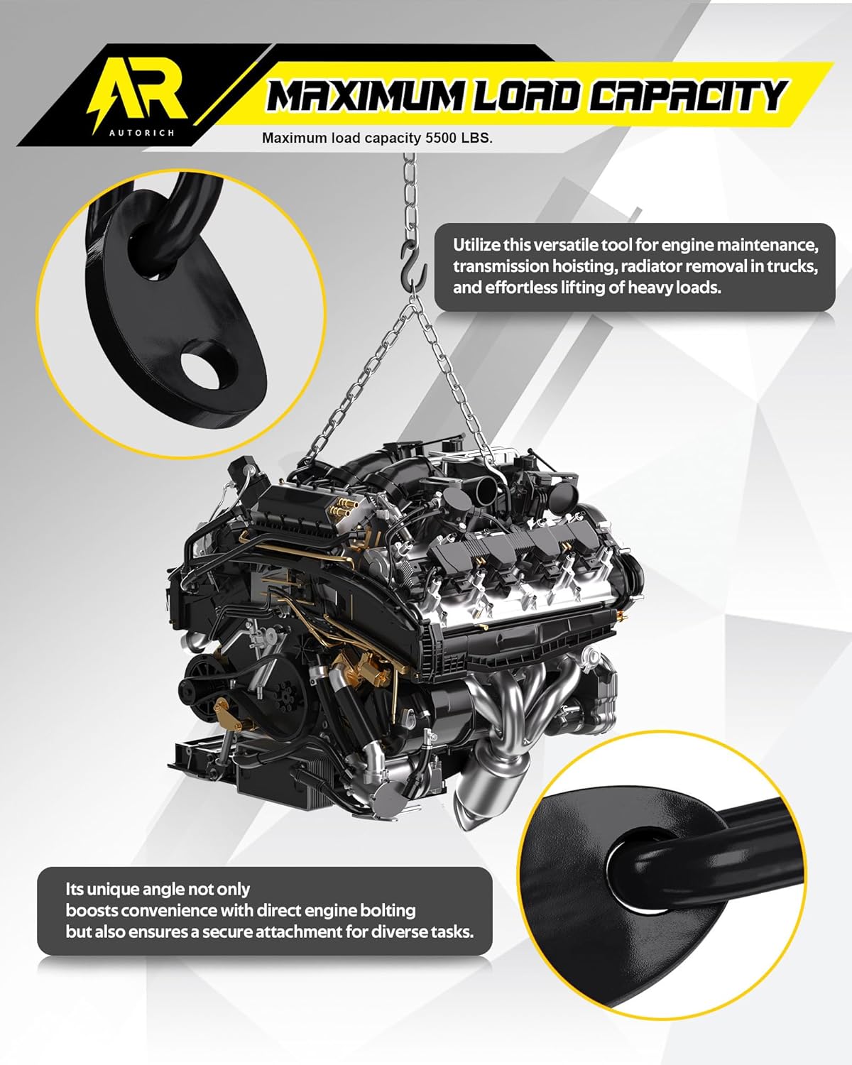 - [Innovative Engineering] Our engine lifting brackets feature a distinctive angled design, enabling direct bolting to engines, transmissions, radiators, and other substantial components. These brackets seamlessly integrate with load levelers and lifting slings, simplifying even the most demanding lifting tasks with precision and ease