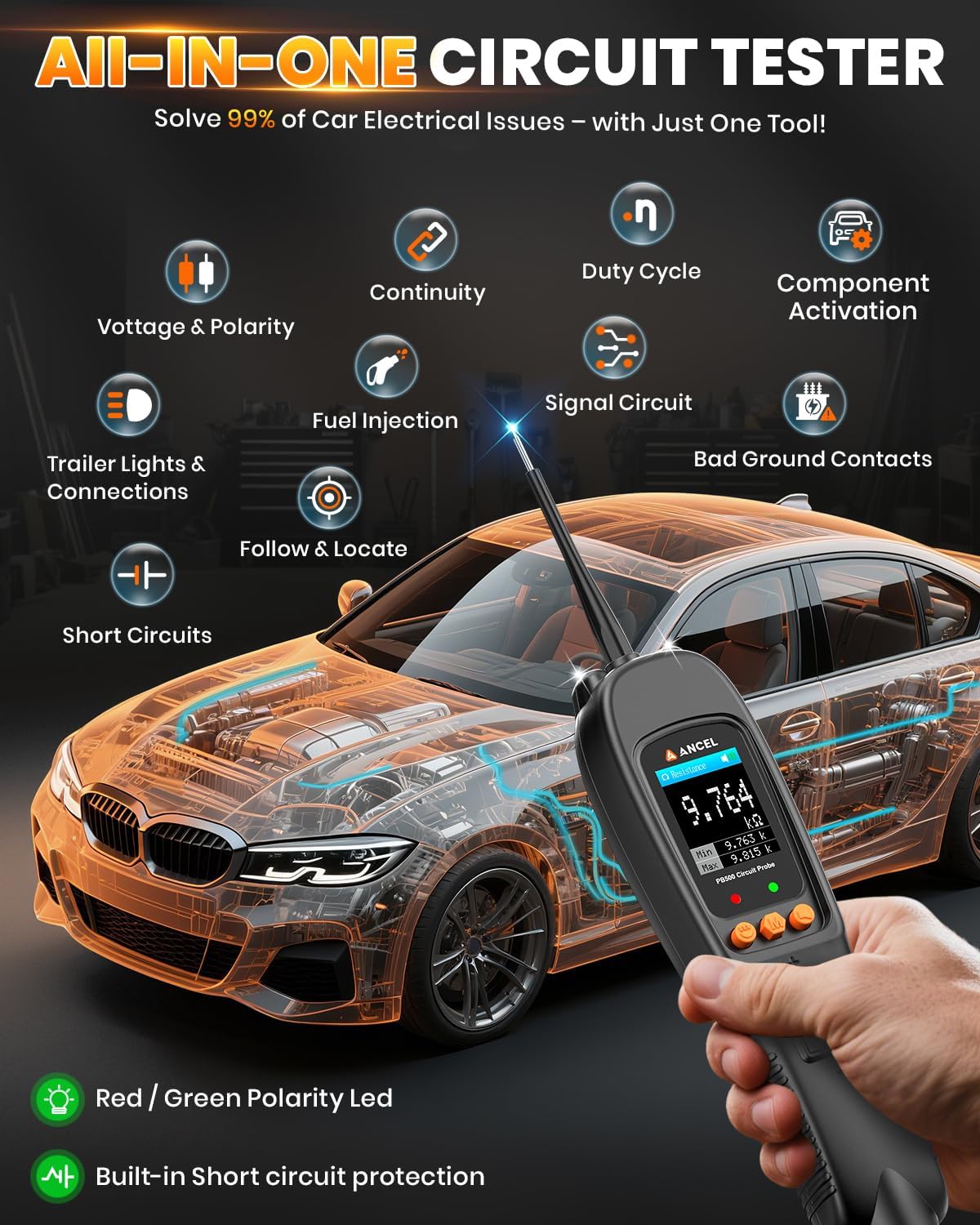 - 🏆【ALL-IN-ONE Power Circuit Tester-Answers to all your questions】ANCEL PB500 automotive power circuit probe tester covers all circuit tests, including ⚡Circuit breaker/open test ⚡DC Voltage test (Resolution 0.1V) ⚡AC Voltage test ⚡Resistance test ⚡Doide test⚡Polarity test ⚡Continuity test ⚡Ground test ⚡Component activation ⚡Signal circuit test ⚡Duty Cycle ⚡Fuel Injection ⚡Relay Test ⚡Fuse Test. It is simple to operate and easy to use, Intuitive interface with ergonomic design makes it be best gif.t for all novice drivers or pro circuit repairers!