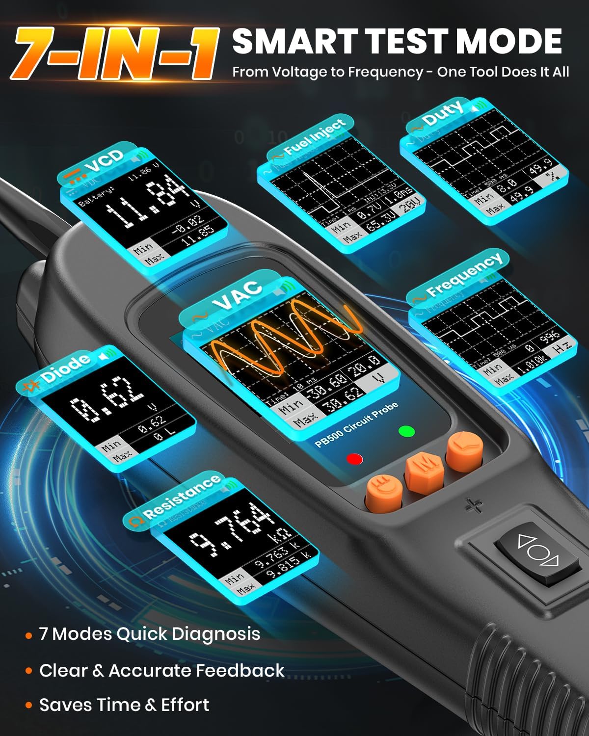 - 🌟【Accurate Fuel System Diagnostics-Specialized Fuel Injection Tests】Struggling with the vehicle starting problems, poor acceleration, or fuel inefficiency? The he PB500 AutomotiveCircuit Tester’s Fuel Injection Test Mode is designed for fast, precise diagnostics of the fuel injection circuit. It quickly analyzes the fuel delivery process, ensuring that each injector is firing precisely as it should. Plus, the addition of Frequency and Duty Cycle modes allows you to dig deeper into your vehicle's performance, uncovering issues that standard diagnostic tools can't detect, and giving you the insights you need to make accurate repairs and get your vehicle running at its best.