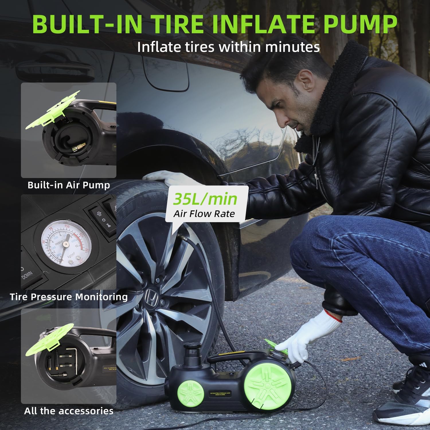 - One-Touch Operation: Saving time and effort greatly, instant control system of elelctric jack for car completes car lifting in just 2 minutes, significantly boosting efficiency compared to traditional manual jacks