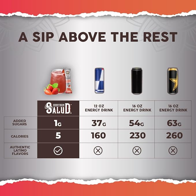 - US vs THEM - Unlike traditional energy drinks loaded with sugars, Salud will turn plain water into a mouth-watering Agua Fresca drink with only 1g of added sugar and 5 calories per serving. You can feel good about starting your mornings and workouts with Salud!