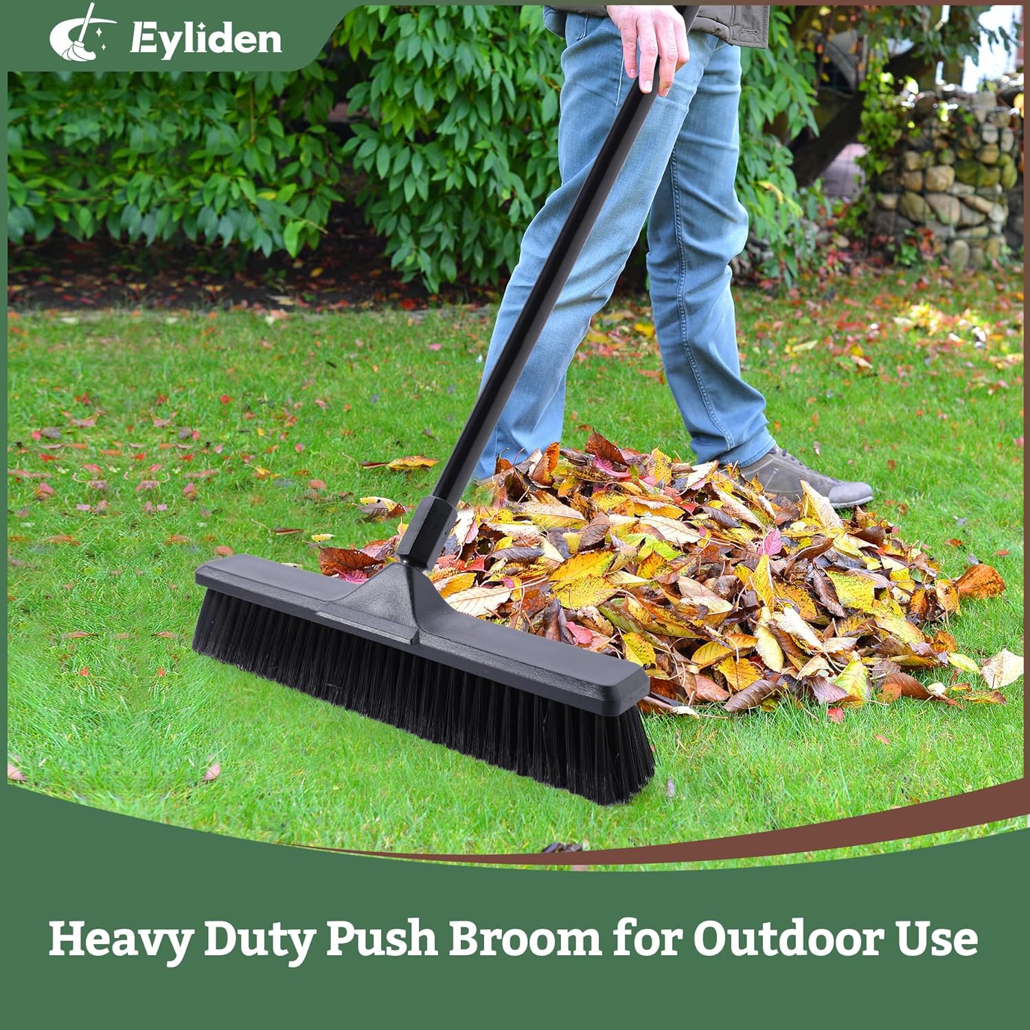 - 【Versatile Use Heavy Duty Push Broom】The width of the sweeper broom head is about 18 inch, so Eyliden broom can sweep a large area at a time. Our push broom/brush for outdoor All Types of Indoor, Outdoor, Garage, Shop, Sidewalk, Patio, Deck, Backyard, Garden, Lawn, Concrete, And Other Multi Surface To Sweep Away Debris, Like Stones, Leaves, Grass, Soil, Snow, Gravel And All Kind of Floor Cleaning