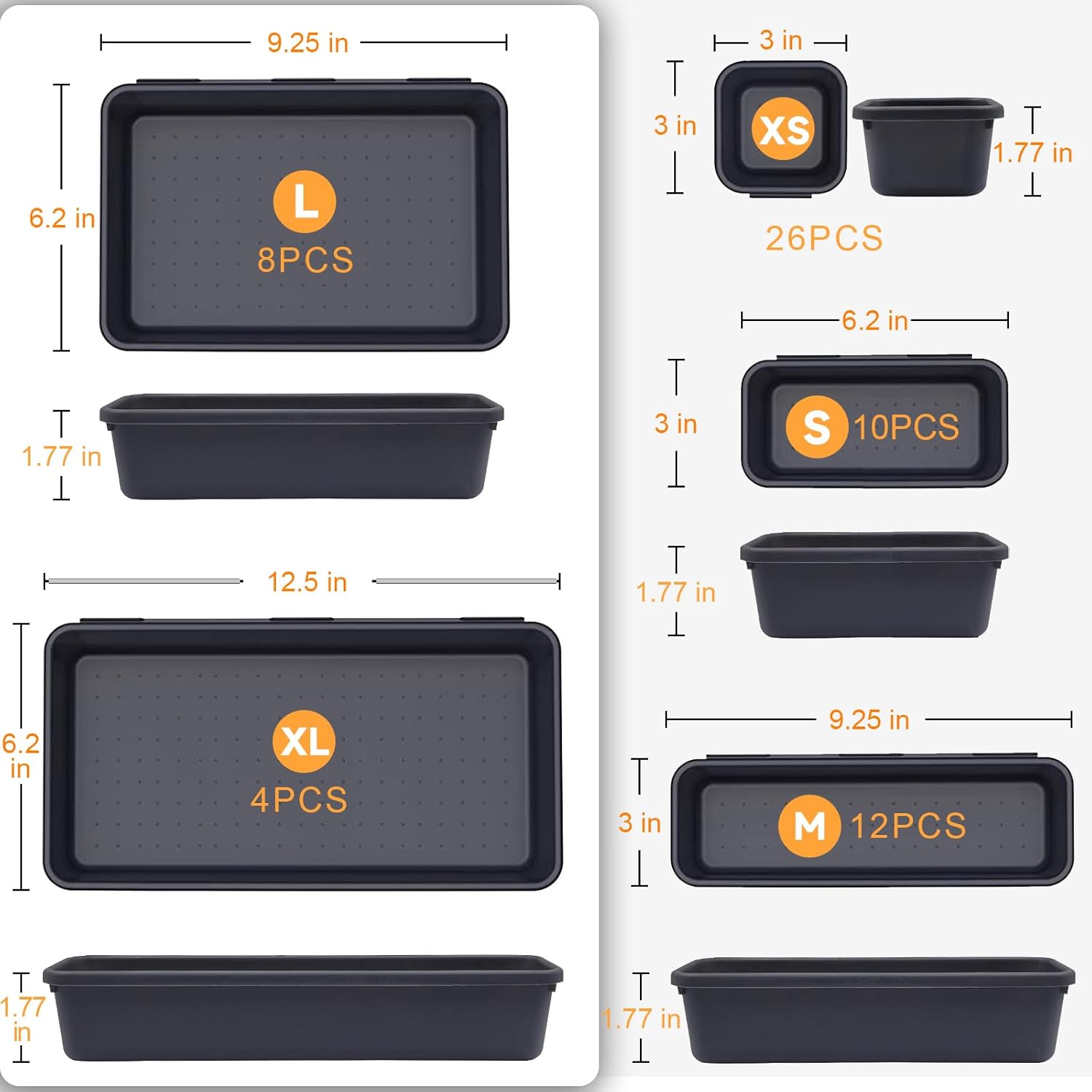 - [60 Pack & 5 Sizes] - Our tool box organizer bins include 60 trays:4 x XL size (12.5x6.2x1.77in), 8 x L size (9.25x6.2x1.77in), 12 x M size(9.25x3x1.77in), 10 x S size(6.2x3x1.77in), 26 x XS size(3x3x1.77in).